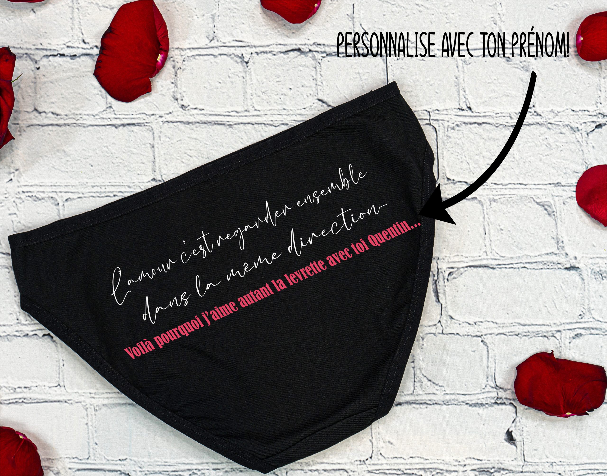 Ajoutez une touche d’humour et de sensualité à vos moments intimes avec cette culotte noire sexy, décorée du message « L’amour c’est regarder ensemble dans la même direction ». Vous pouvez personnaliser ce message en remplaçant [Prénom] par le nom de votre choix, créant ainsi un cadeau vraiment unique et intime. Conçue pour les femmes audacieuses, cette lingerie combinant confort et provocation saura séduire votre partenaire à coup sûr.