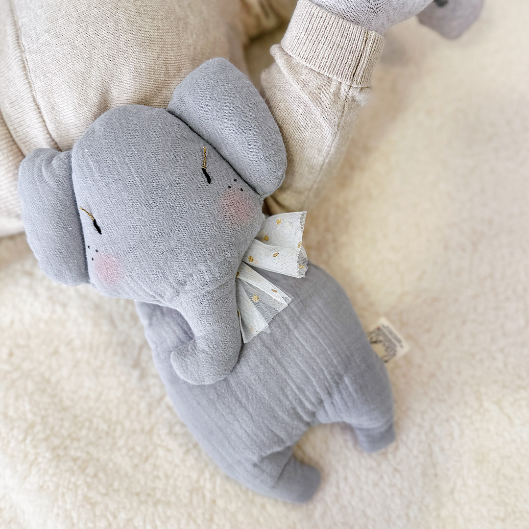 Le doudou Mr Éléphanto est réalisé en triple gaze de coton (100%) de couleur grise. Le tissu est labellisé Oeko-tex (sans produits chimiques) et son petit nœud est en tulle de nylon (100%) à pois dorés. Il est cousu à la machine (non amovible). Tous les éléments du visage sont brodés à la main.