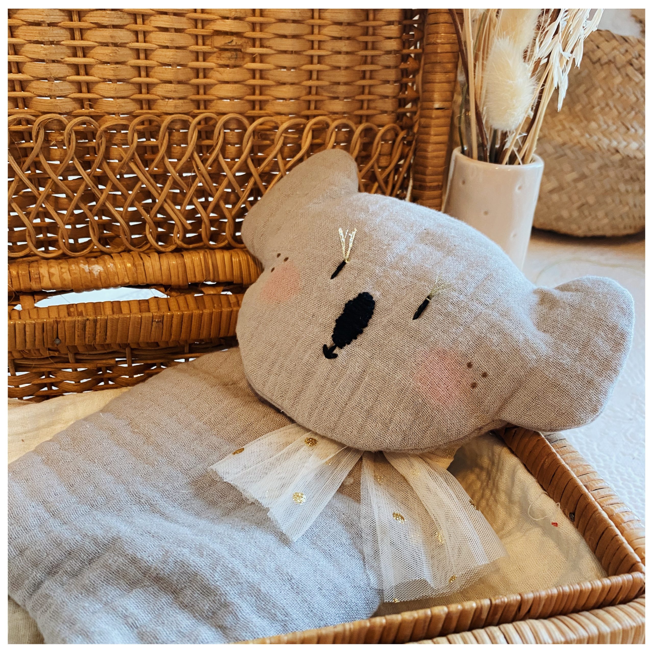 Le doudou Mr Koala est réalisé en triple gaze de coton (100%) de couleur gris taupe. Le tissu est labellisé Oeko-tex (sans produits chimiques) et son petit nœud est en tulle de nylon (100%) à pois dorés. Il est cousu à la machine (non amovible). Tous les éléments du visage sont brodés à la main.