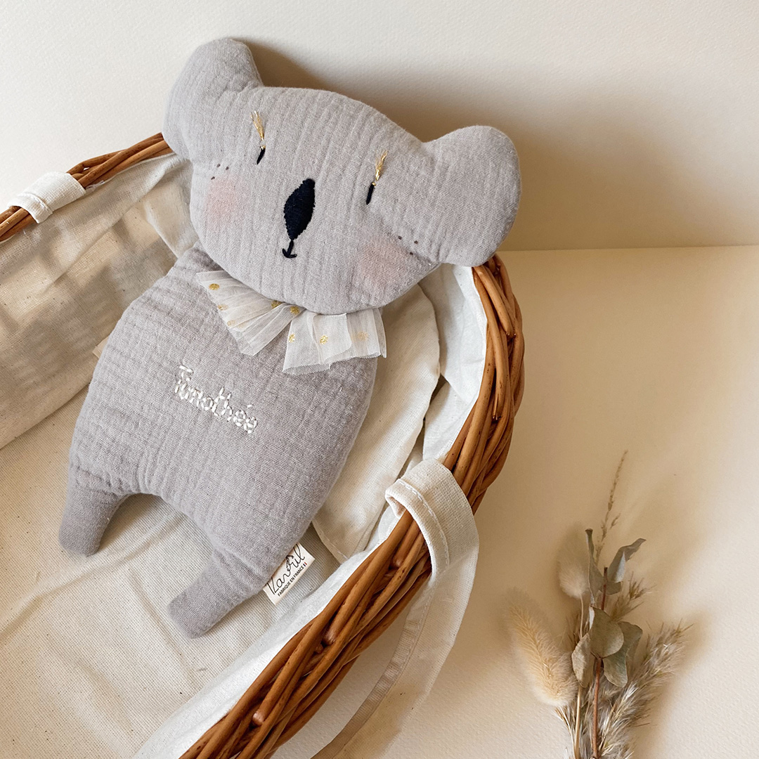 Possibilité de personnaliser le doudou Mr Koala avec le prénom de bébé, brodé à la main en fil de coton de couleur écrue ou en fil de lurex doré.