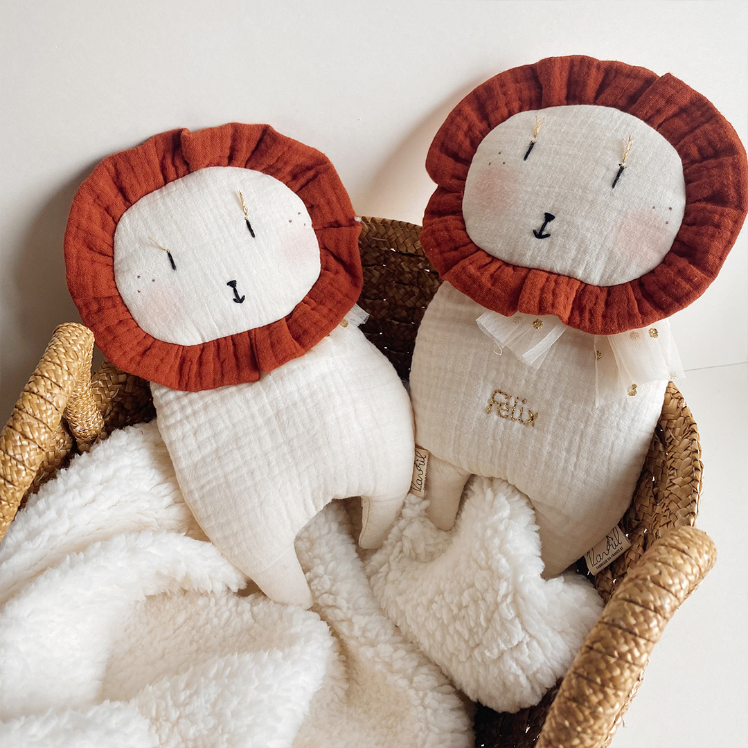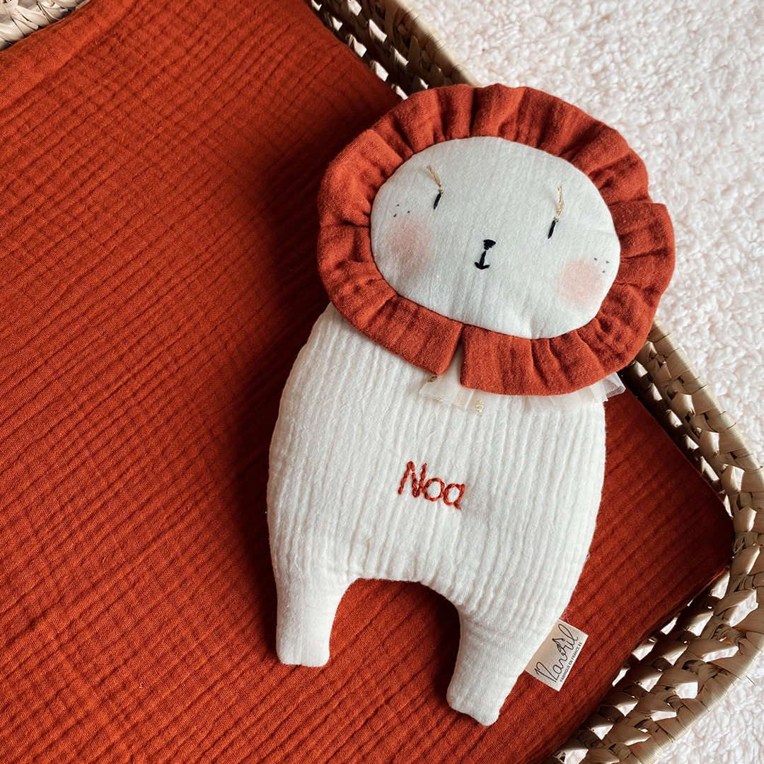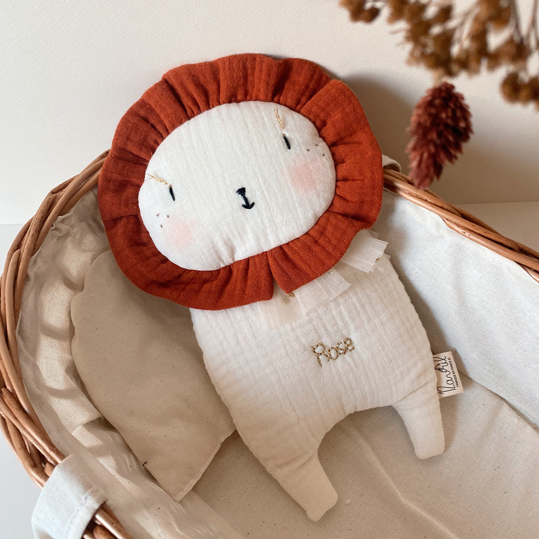 Possibilité de personnaliser le doudou Mr Lion avec le prénom de bébé, brodé à la main, en fil de coton couleur terracotta ou bien en fil lurex doré.