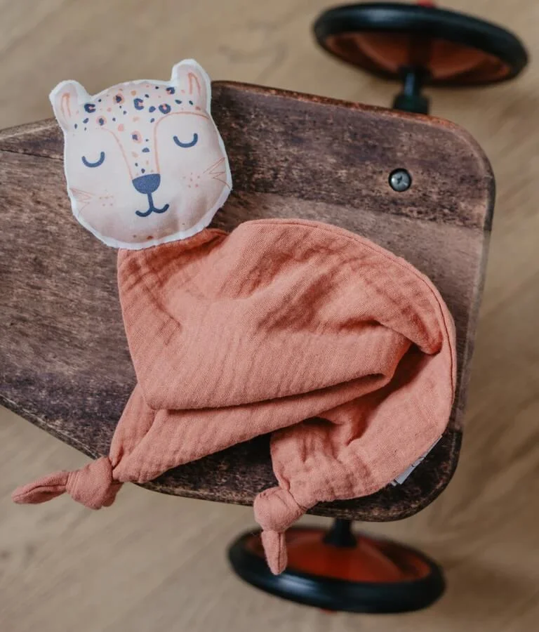 Offrez à bébé un compagnon doux et réconfortant avec ce doudou Panthère en double gaze vert terracotta Carotte & cie.