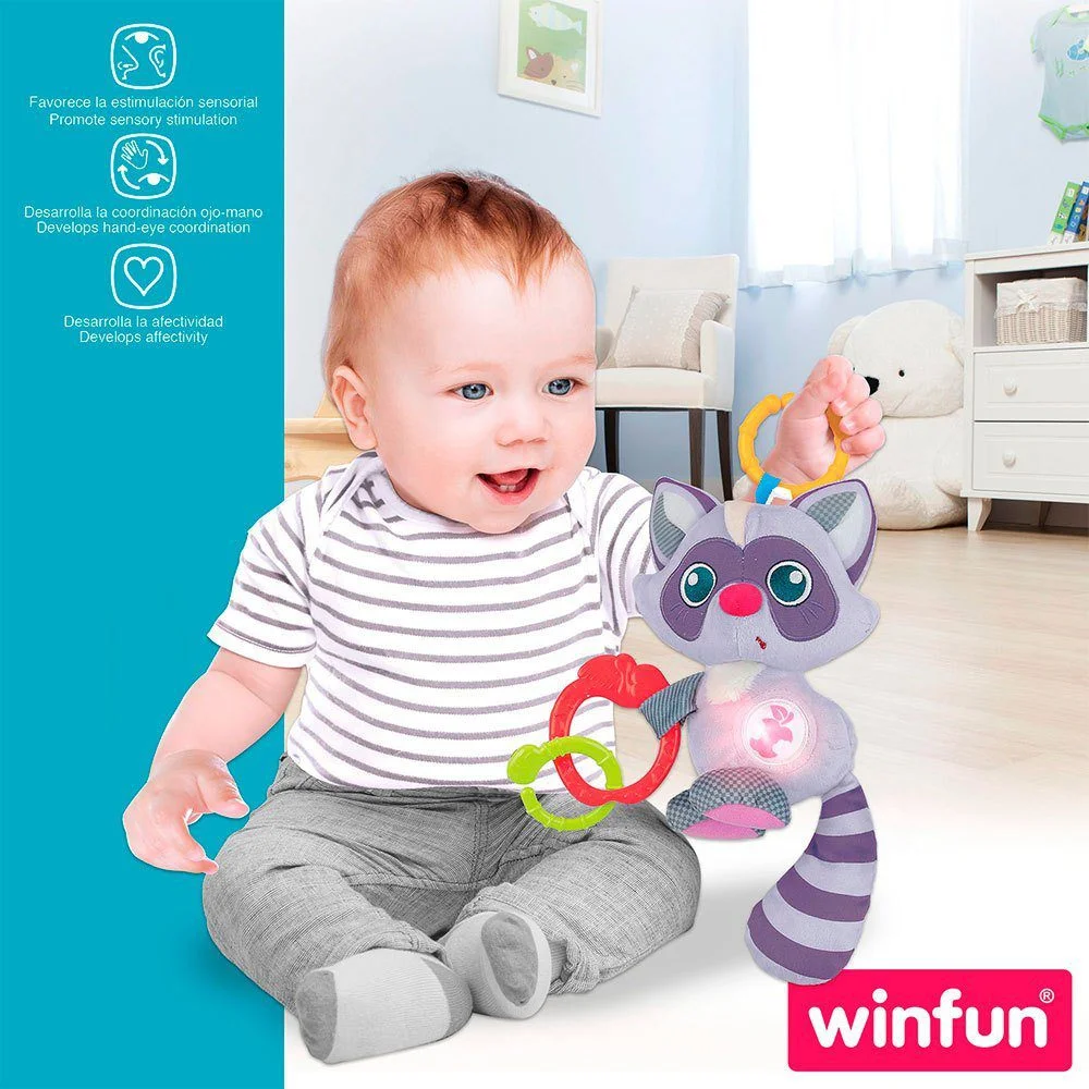 Adorable doudou raton laveur – Winfun, avec sons et phrases amusants pour accompagner votre bébé pendant ses premiers mois.