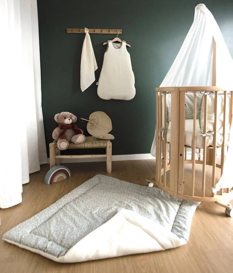 - Extérieur en double gaze écru et intérieur en coton vert à motifs fleuris certifiés sans substance nocive et ouate hypoallergénique.
