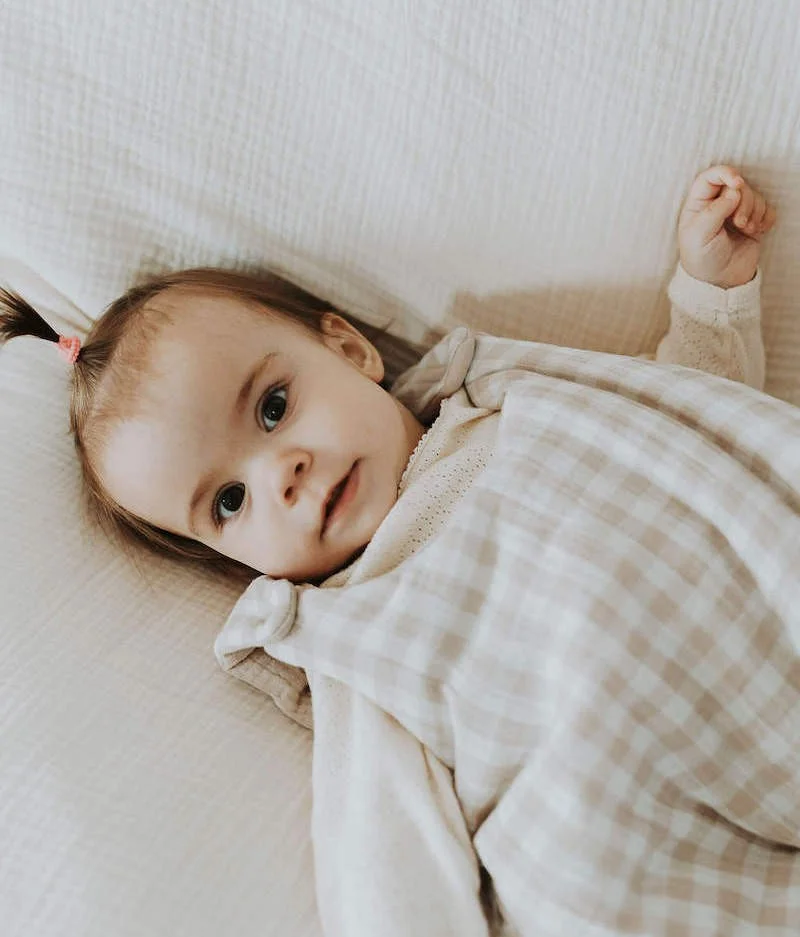 - Extérieur en double gaze de coton vichy galet et intérieur en double gaze de coton uni couleur galet certifiées sans substance nocive.