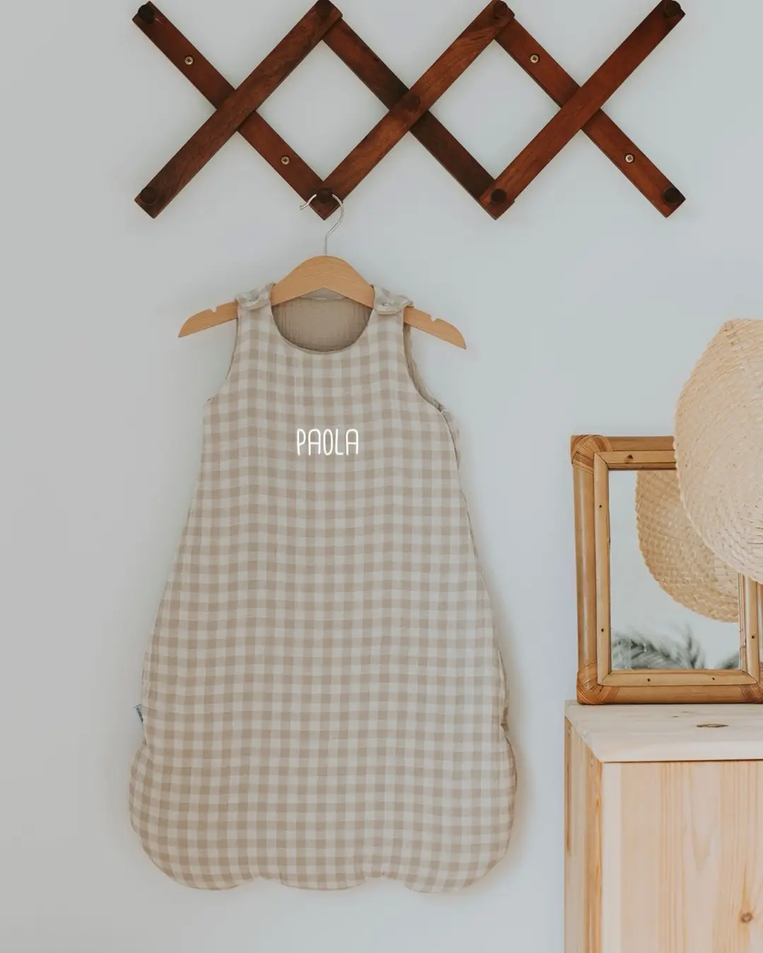 - Extérieur en double gaze de coton vichy galet et intérieur en double gaze de coton uni couleur galet certifiées sans substance nocive et ouate hypoallergénique.
