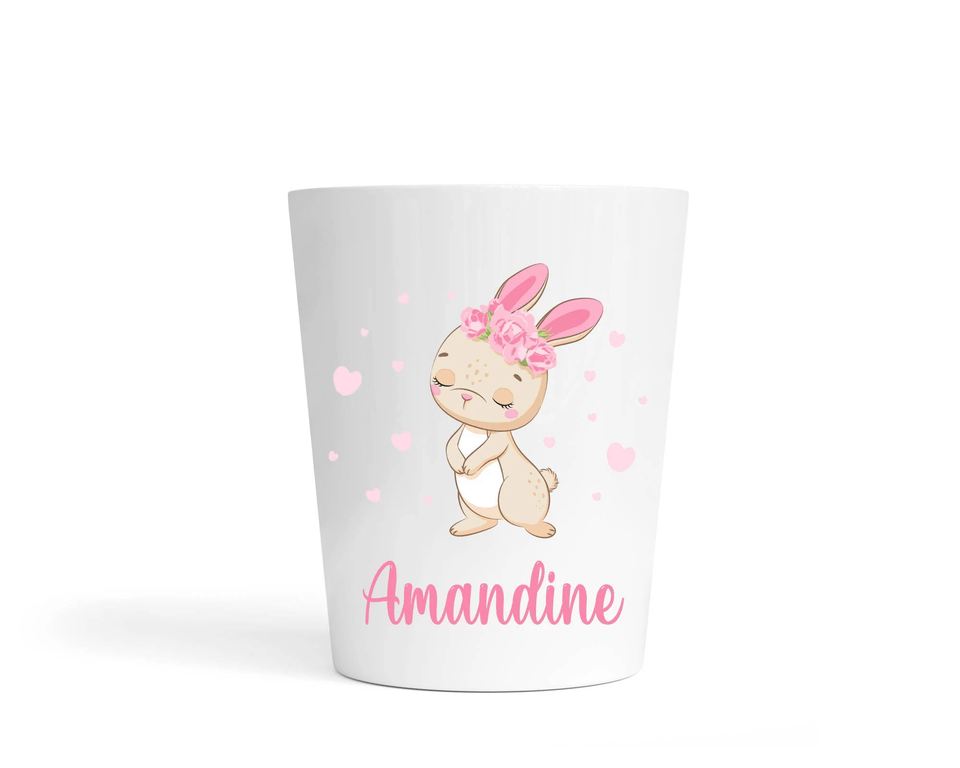 Gobelet Incassable : Gobelet sans BPA avec le prénom de l’enfant et un mignon dessin de lapin rose, facile à emporter et à utiliser. 💧
