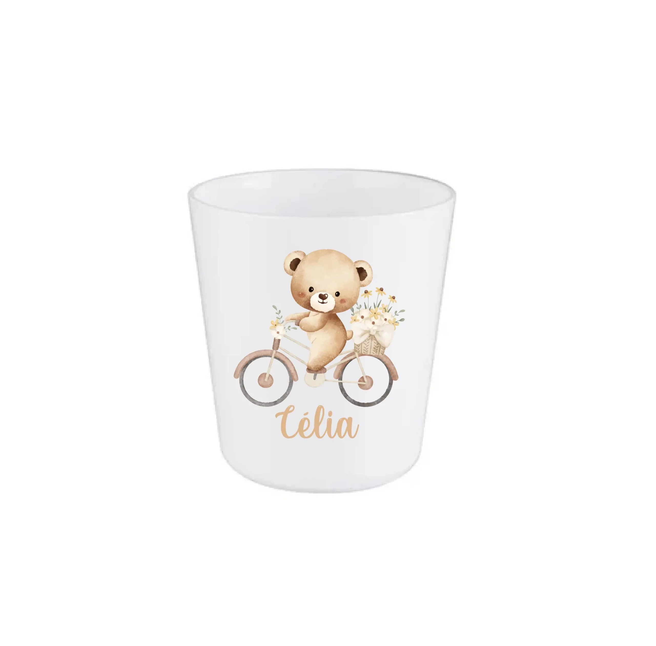 Découvrez notre gobelet illustré d’un petit ours à vélo, plein de douceur et de poésie, personnalisé avec le prénom de l’enfant.