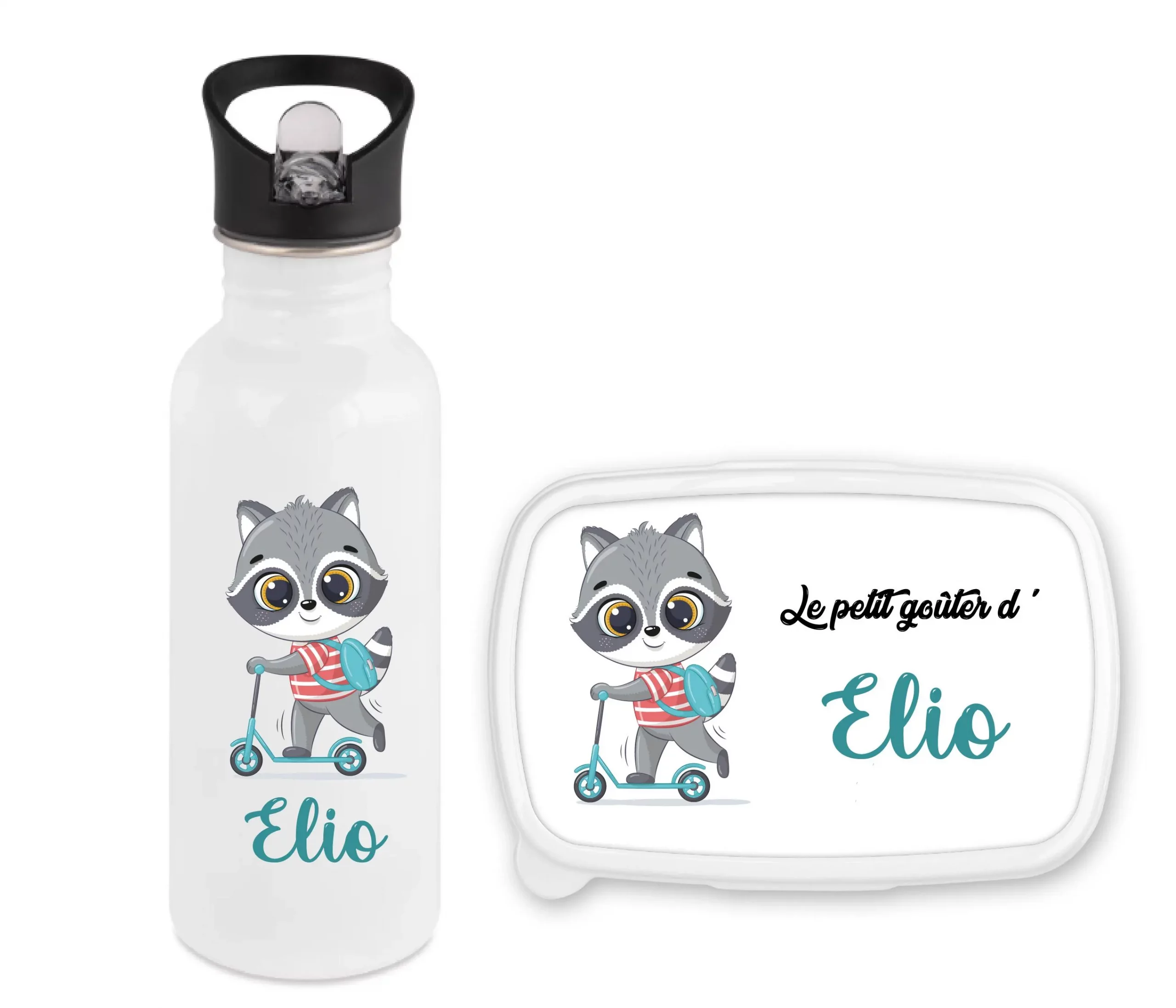 Les deux sont décorés d’un raton laveur trop chou sur sa trottinette, accompagnés du prénom de l’enfant.