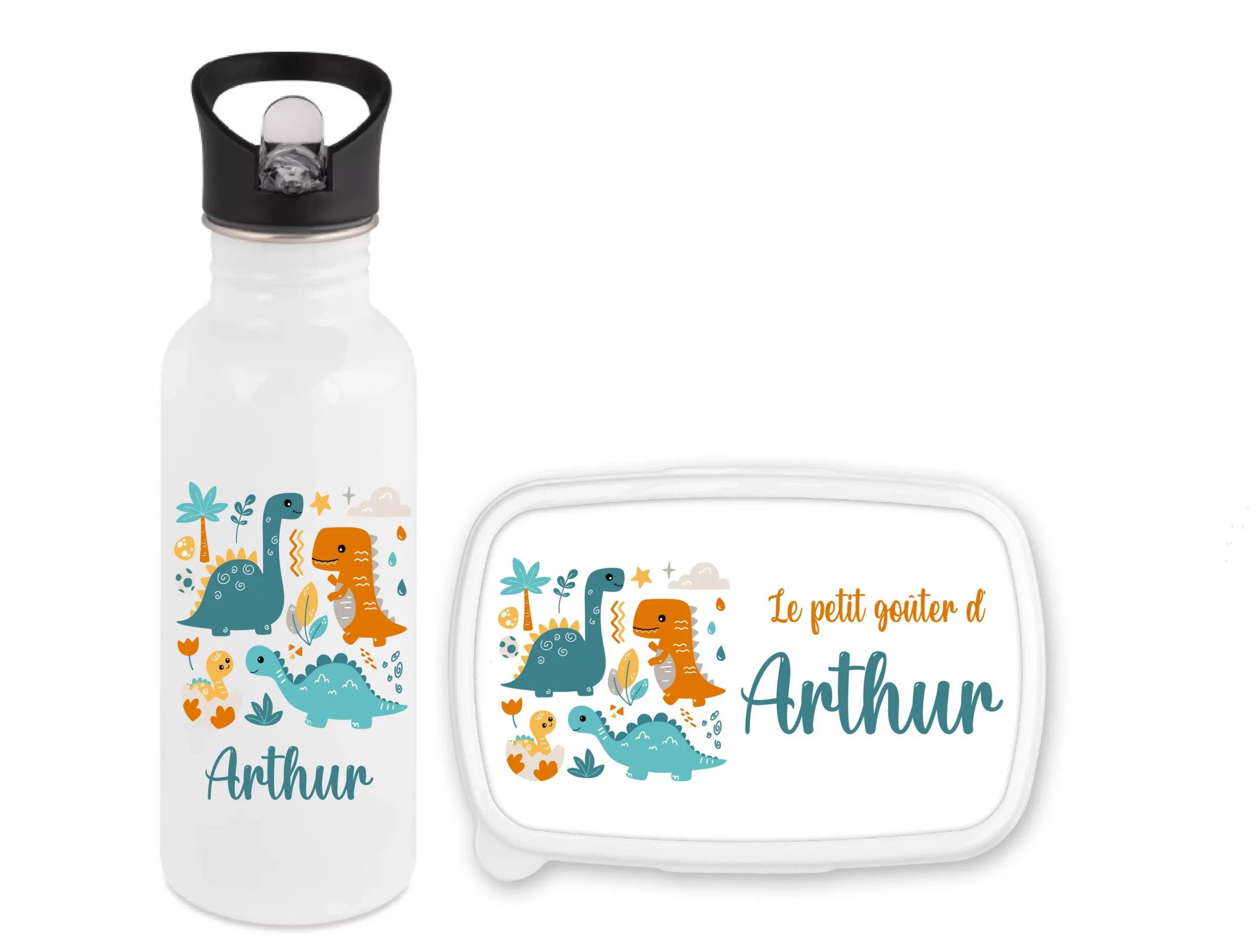 Le motif coloré de dinosaures bleus 🦕 ravira votre enfant, et la personnalisation avec son prénom (exemple : Arthur) rendra ce set unique et spécial.