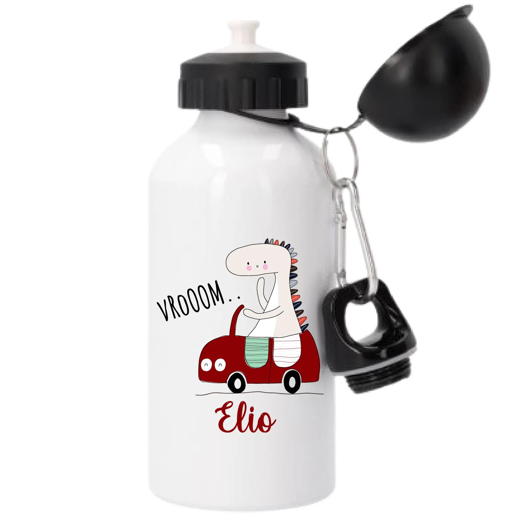 🦖 Motif : Un dinosaure rigolo blanc au volant d’une voiture rouge avec l’inscription « VROOOM… »