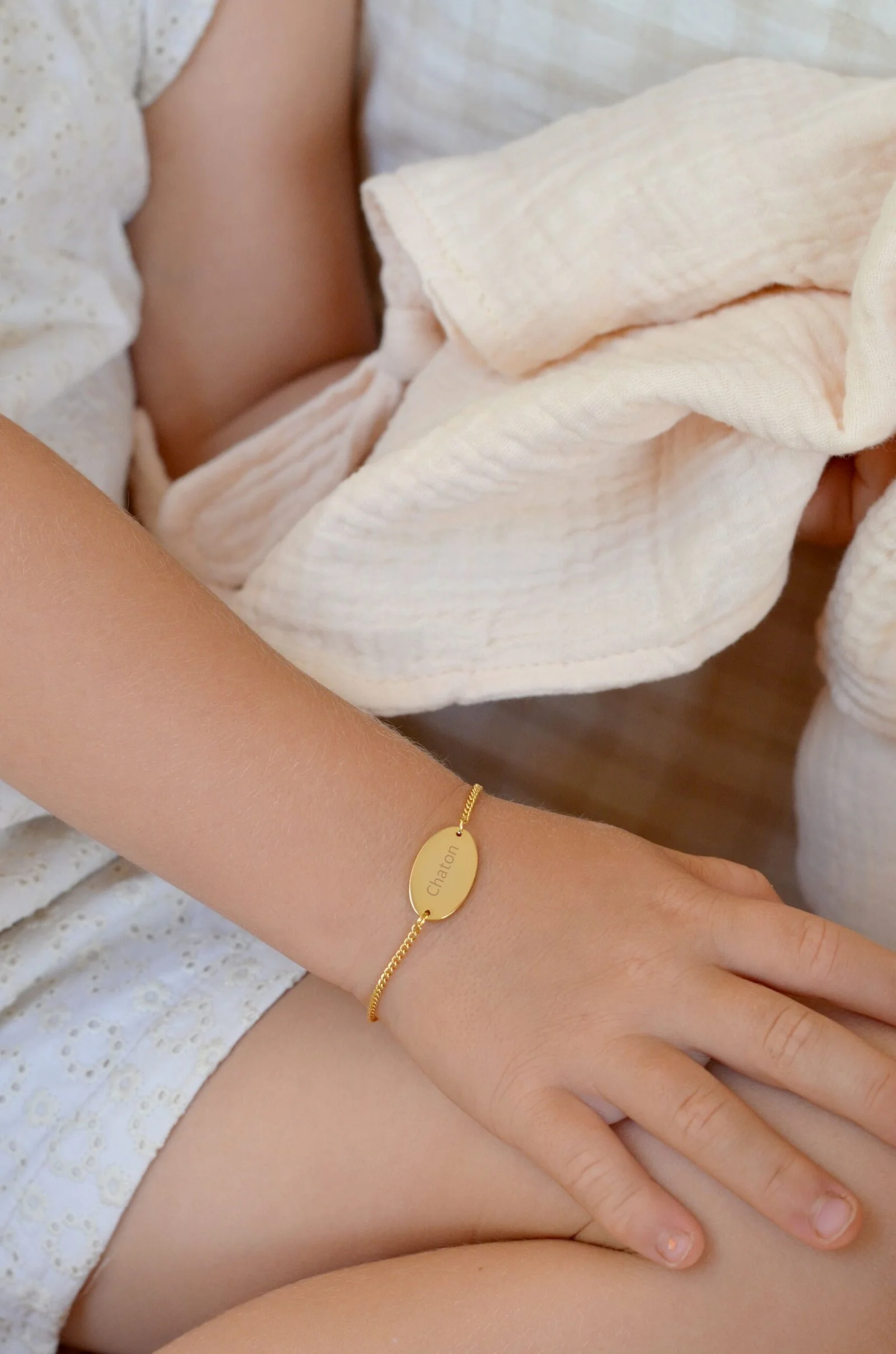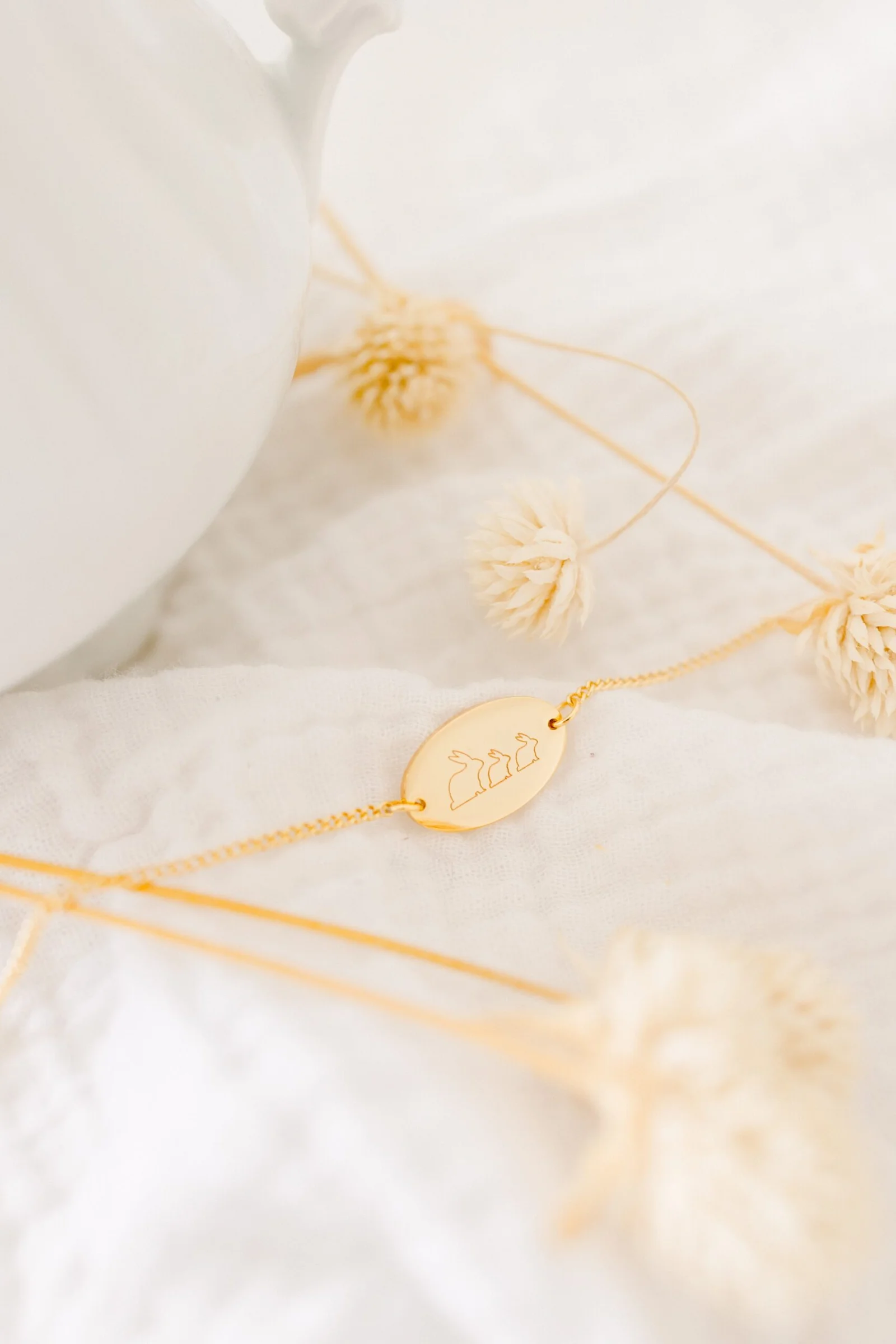 Notre bracelet gourmette ovale gravée de Maman lapin et ses deux petits se personnalise sur son verso avec vos précieux mots doux avant d’être déposée au poignet de votre enfant.