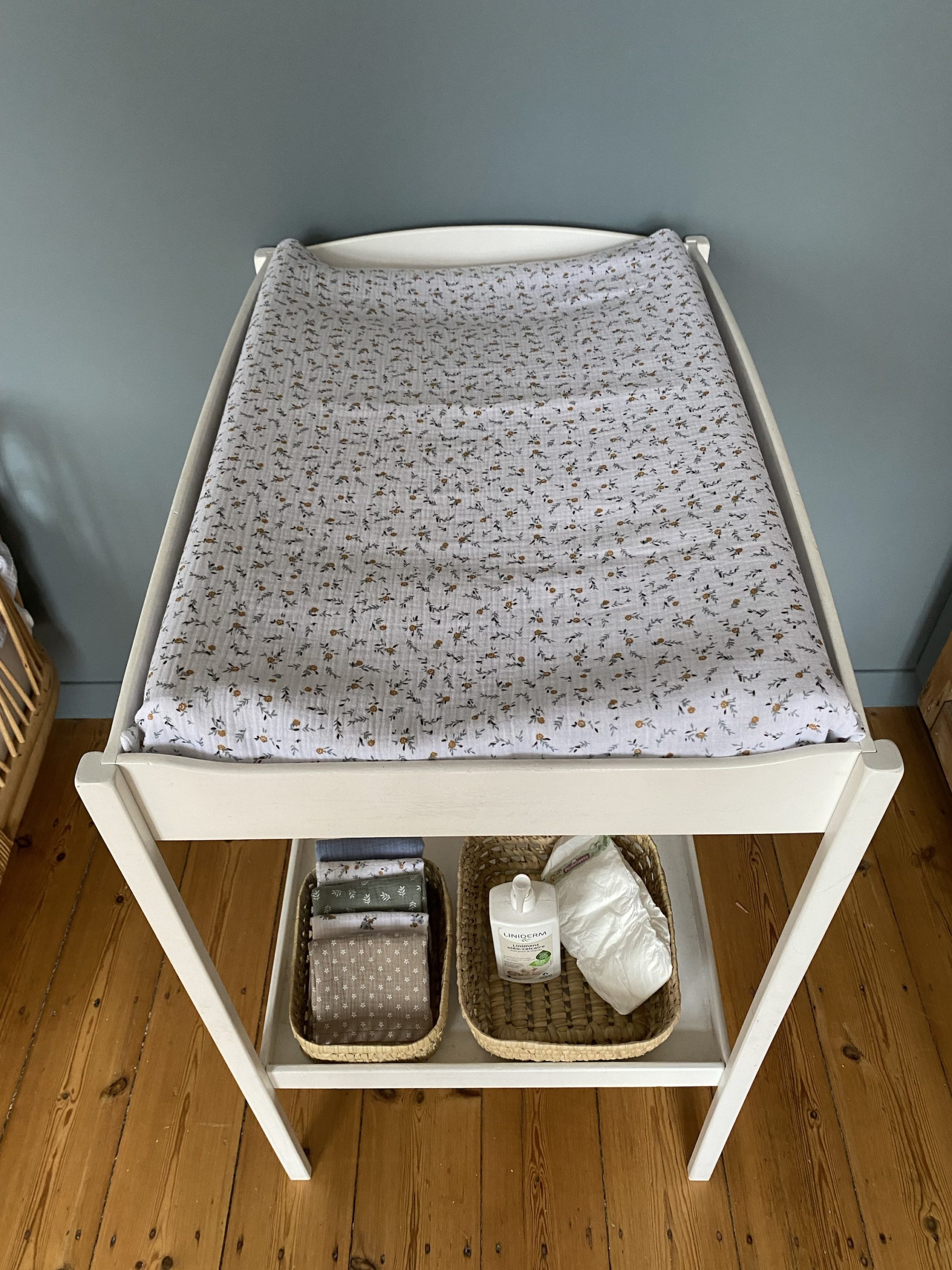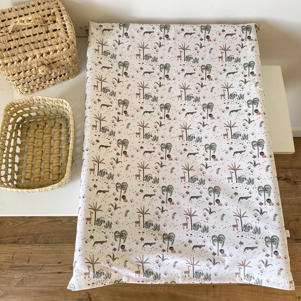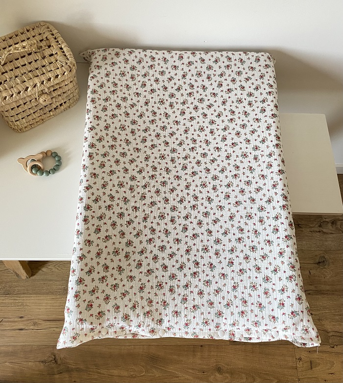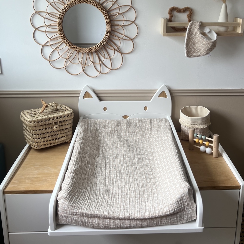 La housse de matelas à langer en double gaze de coton, matière idéale qui ne se repasse pas. (Vous pouvez aussi la choisir en coton)
