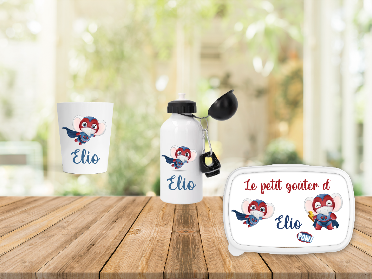 Plongez dans un monde enchanté avec notre ensemble : une gourde en acier inoxydable de 500 ml et une boîte à goûter assortie qui émerveilleront les petits rêveurs. Personnalisé avec le prénom de l’enfant, cet ensemble offre une dose de féérie à chaque gorgée et collation.