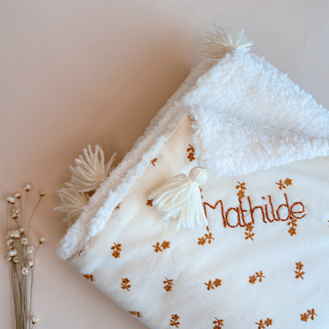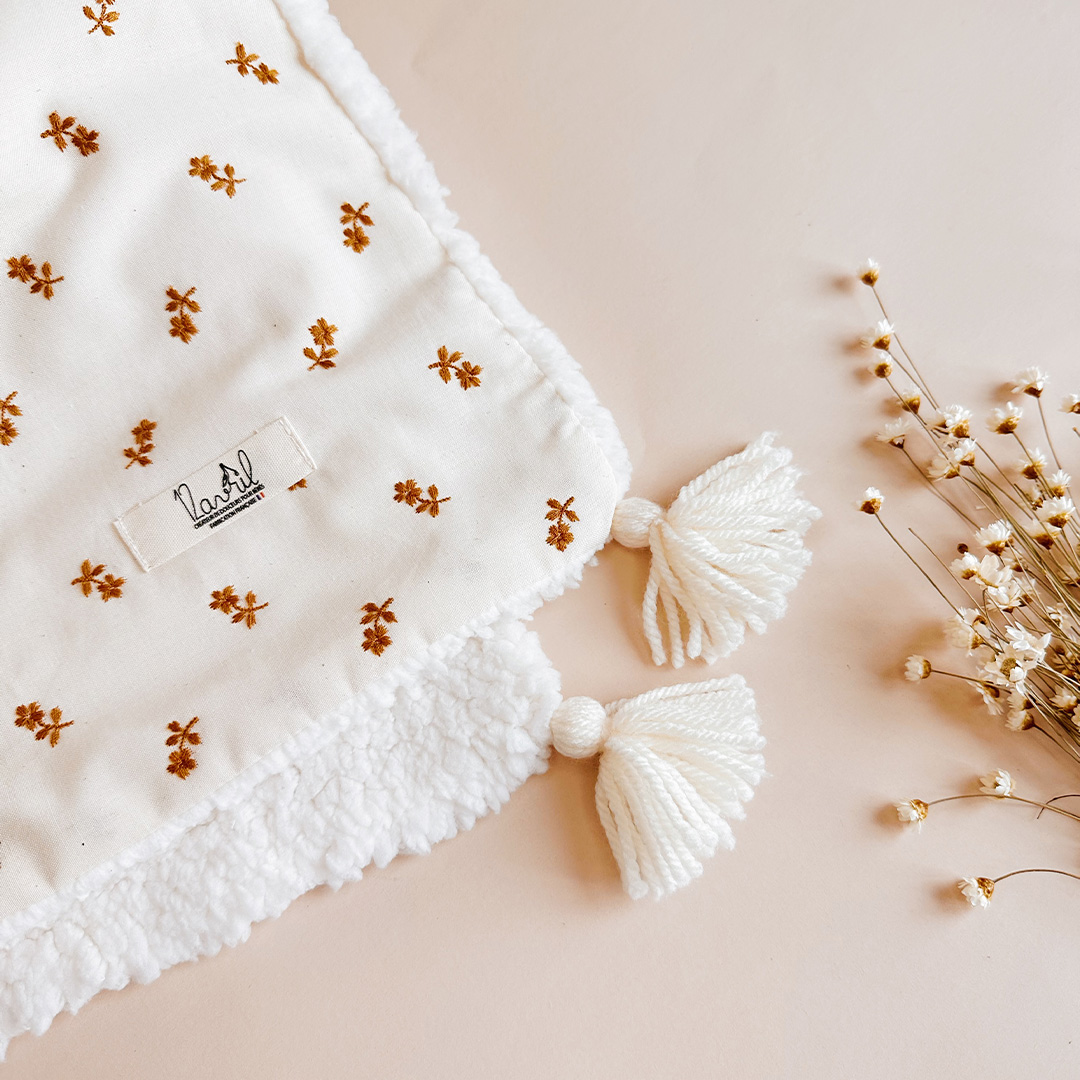 La couverture est une des pièces indispensables du trousseau de bébé. Vous serez surpris par son coté extrêmement doux en fausse fourrure esprit « mouton » , et son côté en popeline de coton biologique, brodée avec de jolies petites fleurs cognac. Les angles sont agrémentés d’un joli pompon écru.