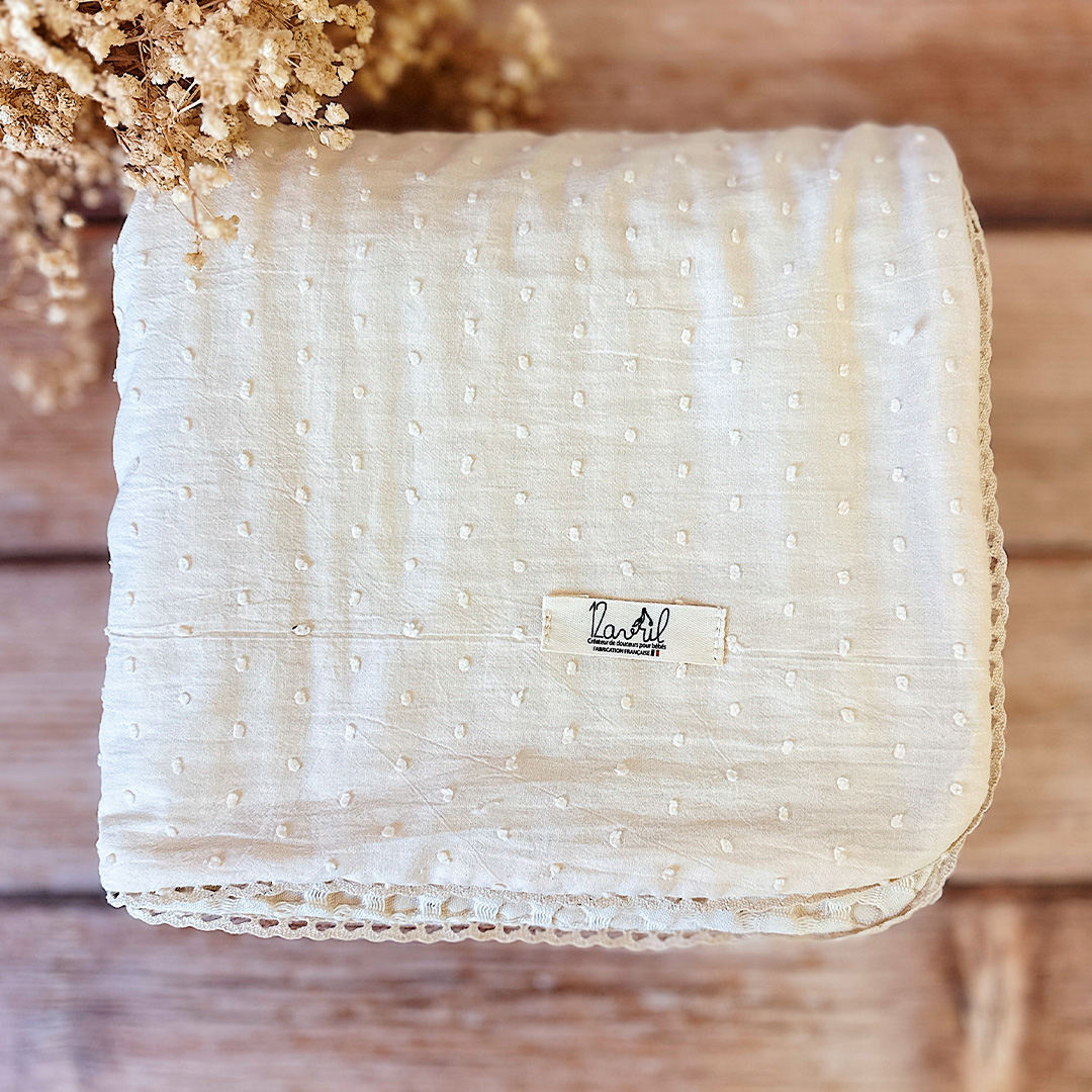 Pour apporter un petit côté rétro, la couverture d’été plumetis est délicatement gansée avec une belle dentelle de coton écrue.
