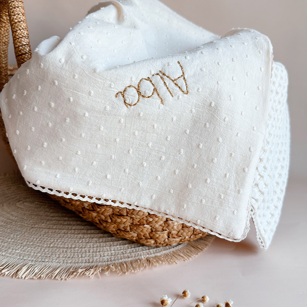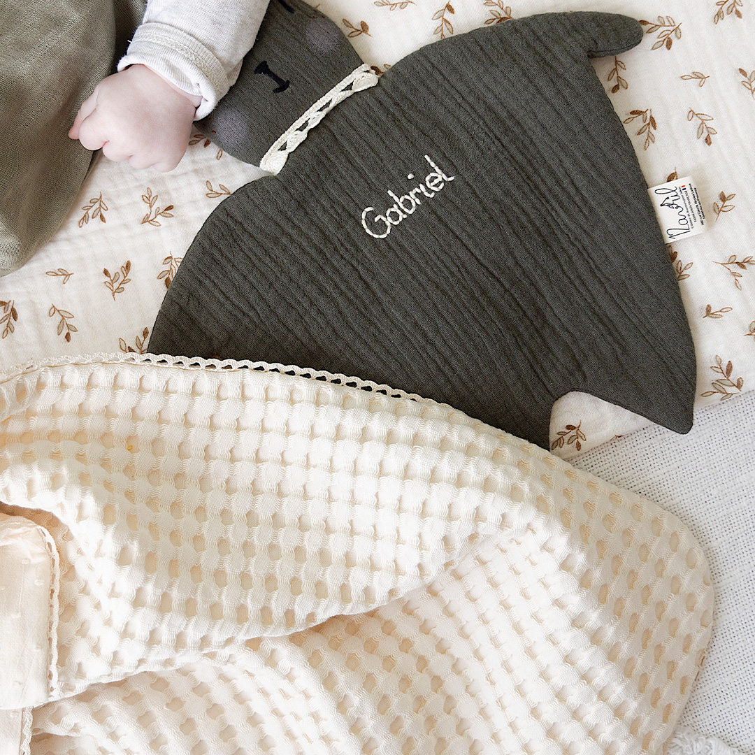 Vous avez la possibilité de personnaliser cette couverture avec le prénom ou le surnom de bébé, brodé à la main dans le coloris de votre choix. La broderie est effectuée dans un angle de la couverture, en biais.