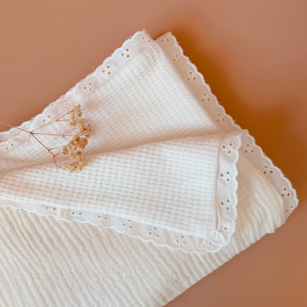 Pour apporter un petit côté rétro, la couverture d’été est délicatement gansée avec une belle dentelle façon broderie anglaise. Retrouvez toute notre ligne maille dentelée chic et intemporelle ici.