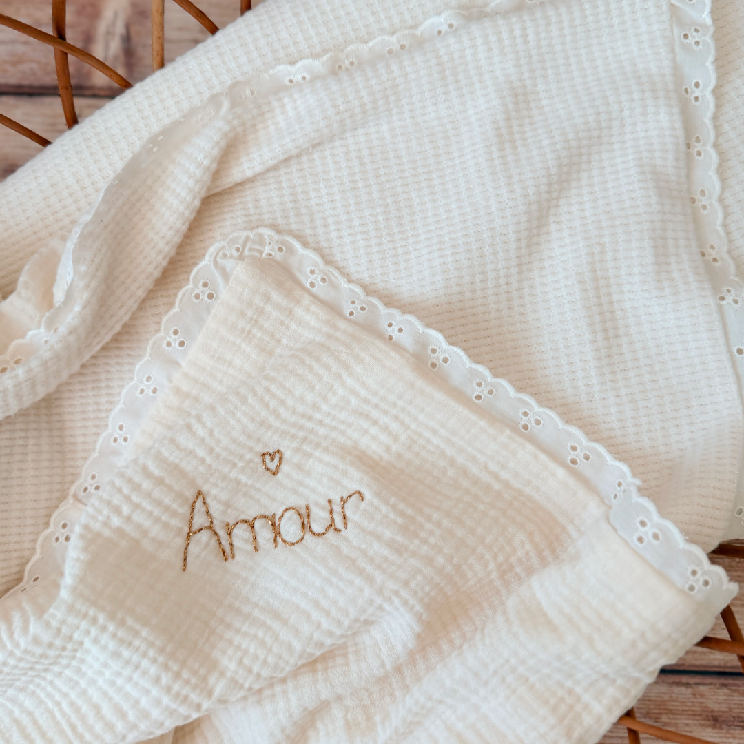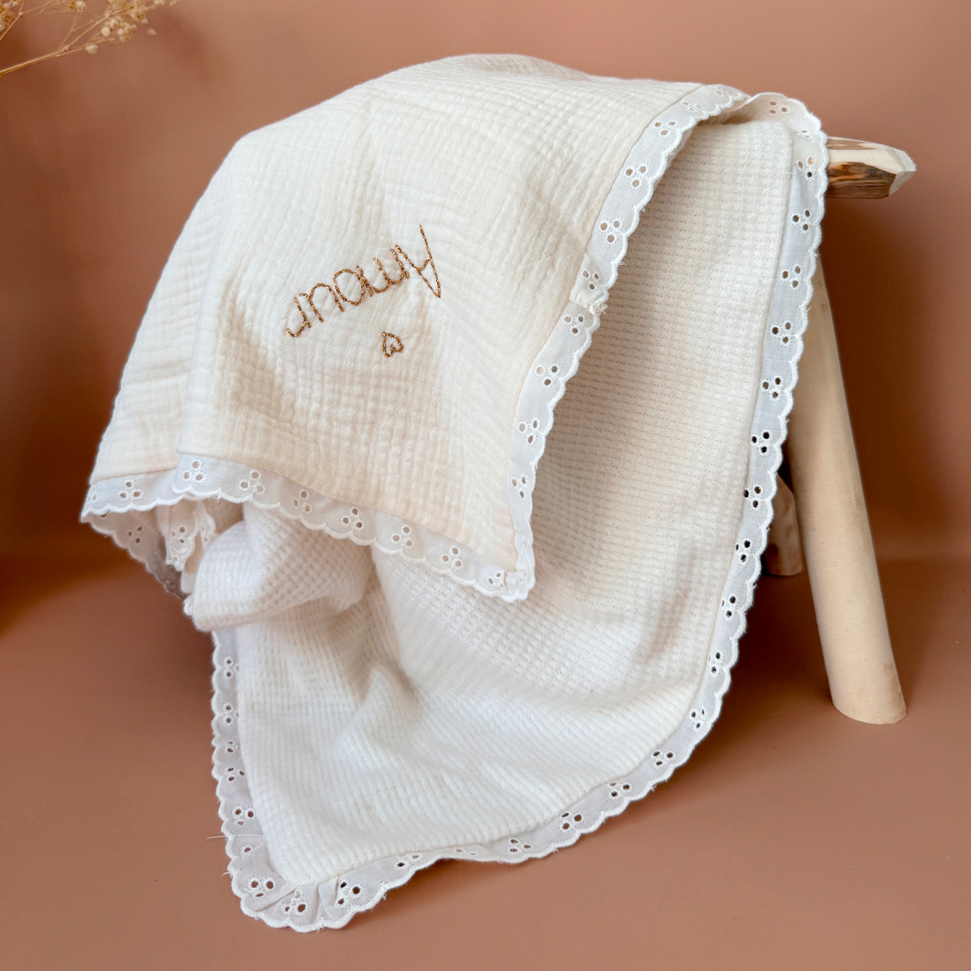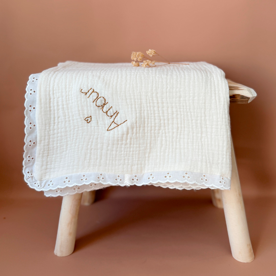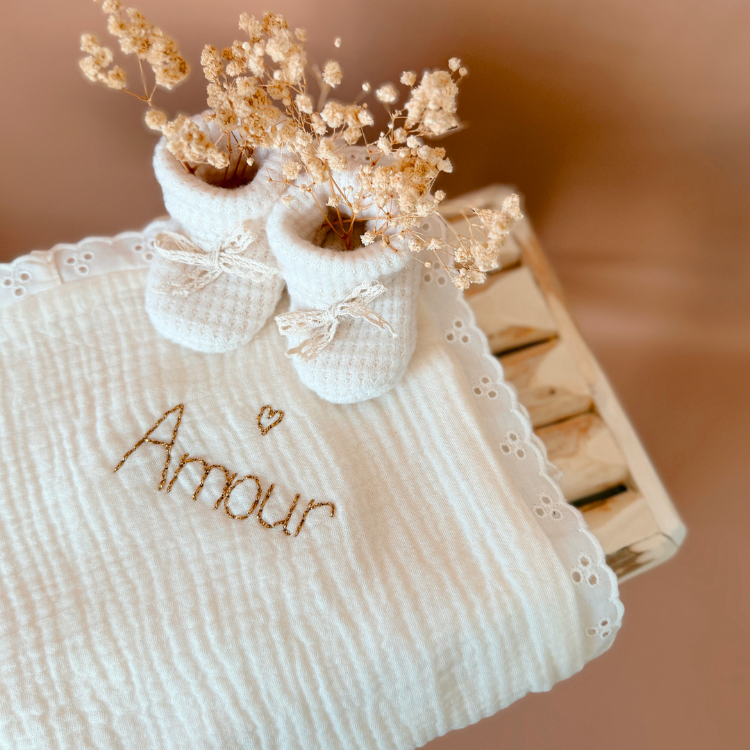 Vous avez la possibilité de personnaliser cette couverture avec le prénom ou le surnom de bébé, brodé à la main dans le coloris de votre choix. La broderie est effectuée dans un angle de la couverture, en biais. Un petit coeur doré sera brodé au dessus du prénom.