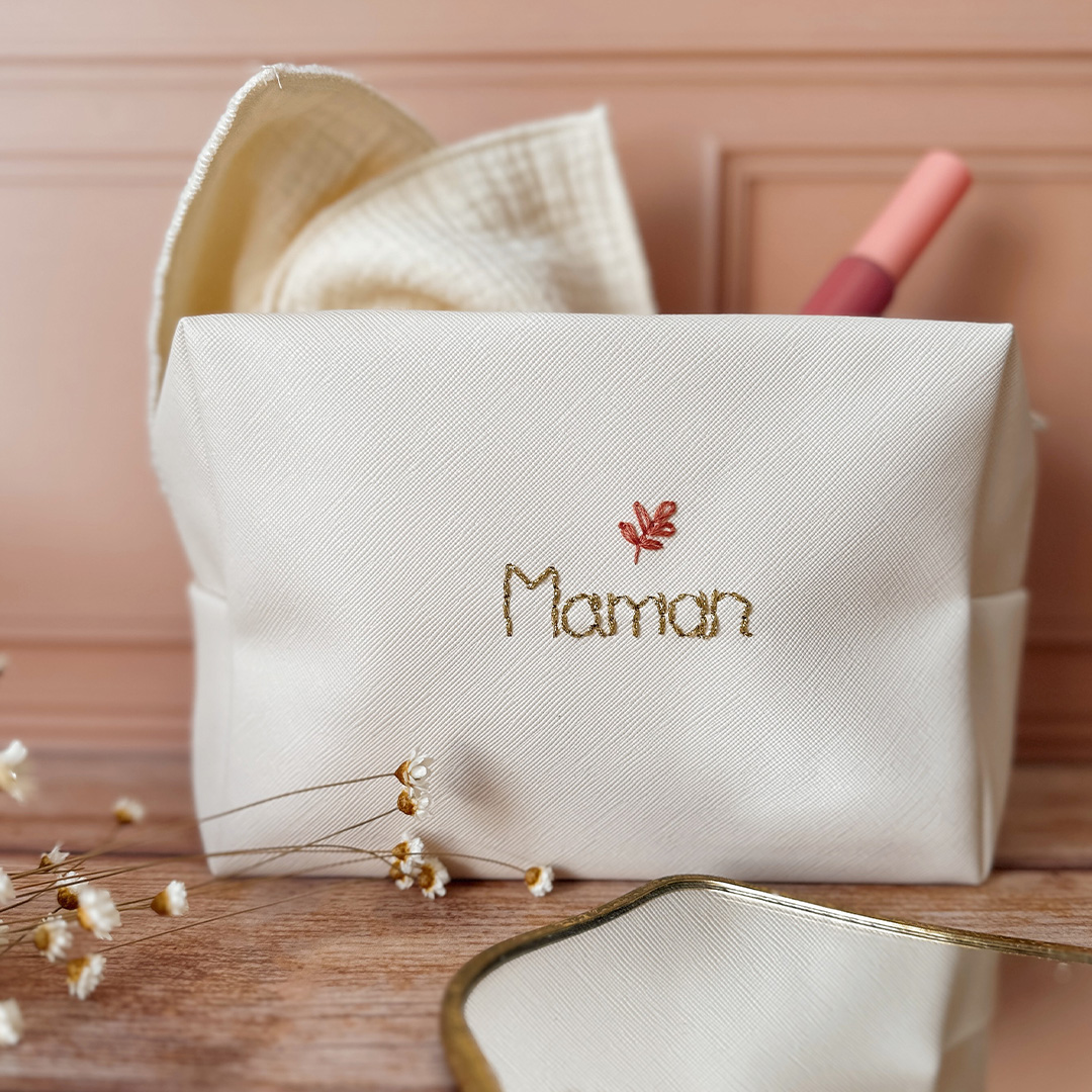 Le petit plus: un grand soufflet vous permettra de maintenir tous vos flacons, et autres produits d’hygiène, debout, dans la trousse. Broderie du prénom réalisée à la main en fil de lurex doré. Délais : 8/10 jours ouvrés.