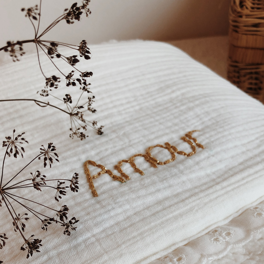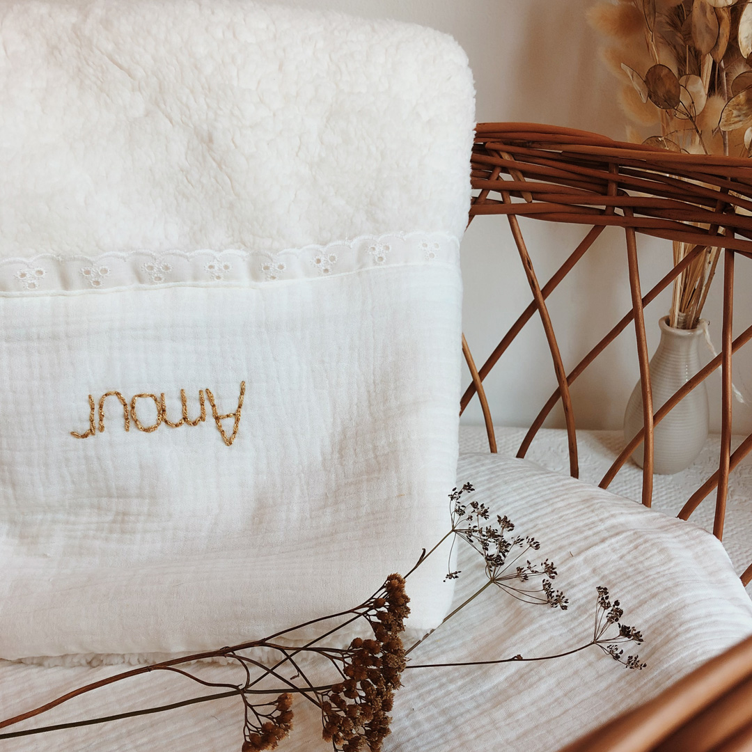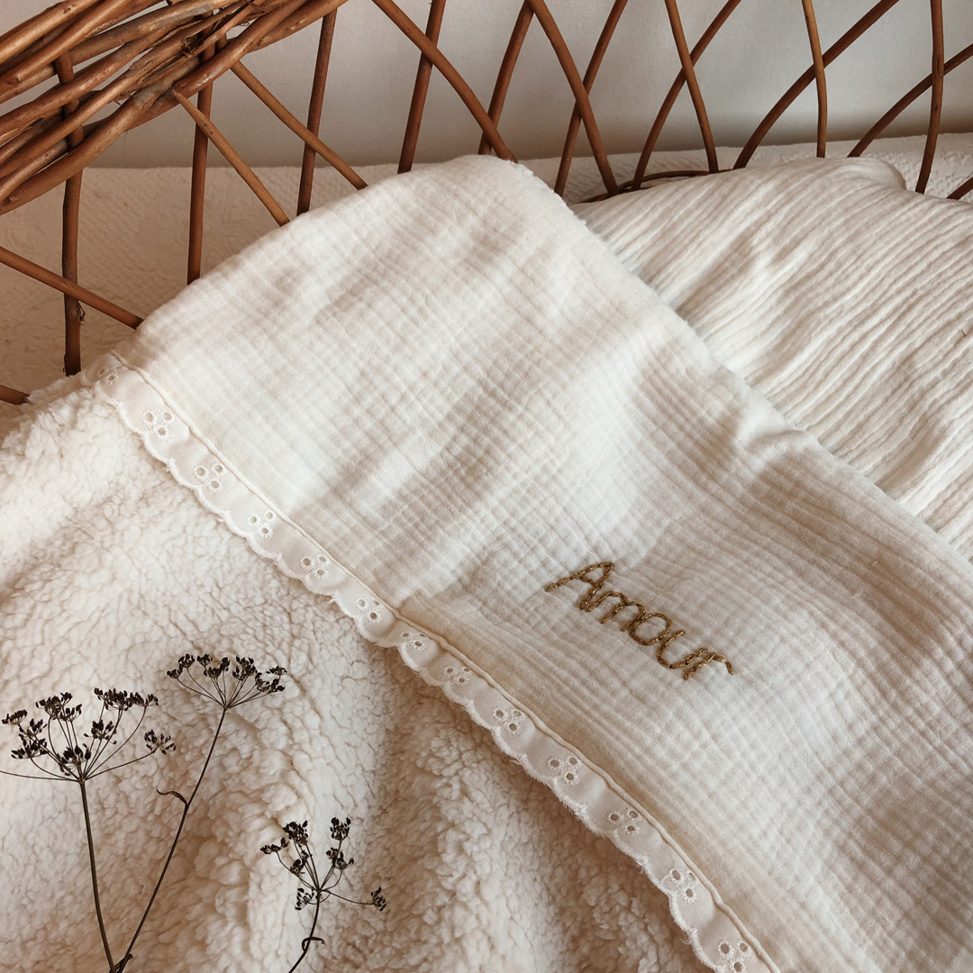 Vous avez la possibilité de personnaliser cette couverture avec le prénom ou le surnom de bébé. Le prénom sera brodé à la main au fil de coton et lurex doré, ultra doux et soyeux.