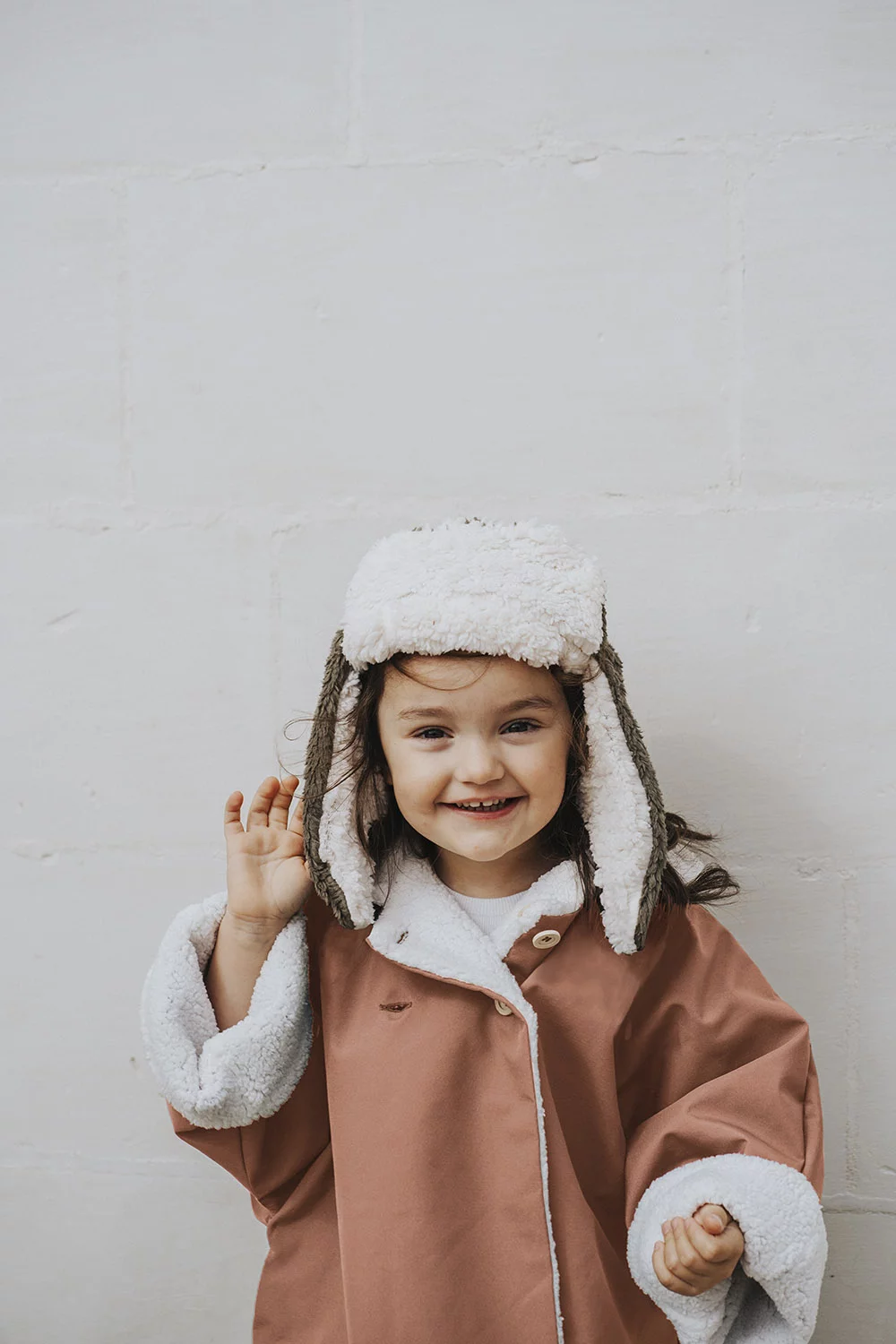 Craquez pour le Manteau réversible Kapoune, avec son côté imperméable pêche et l’autre, en imitation mouton!