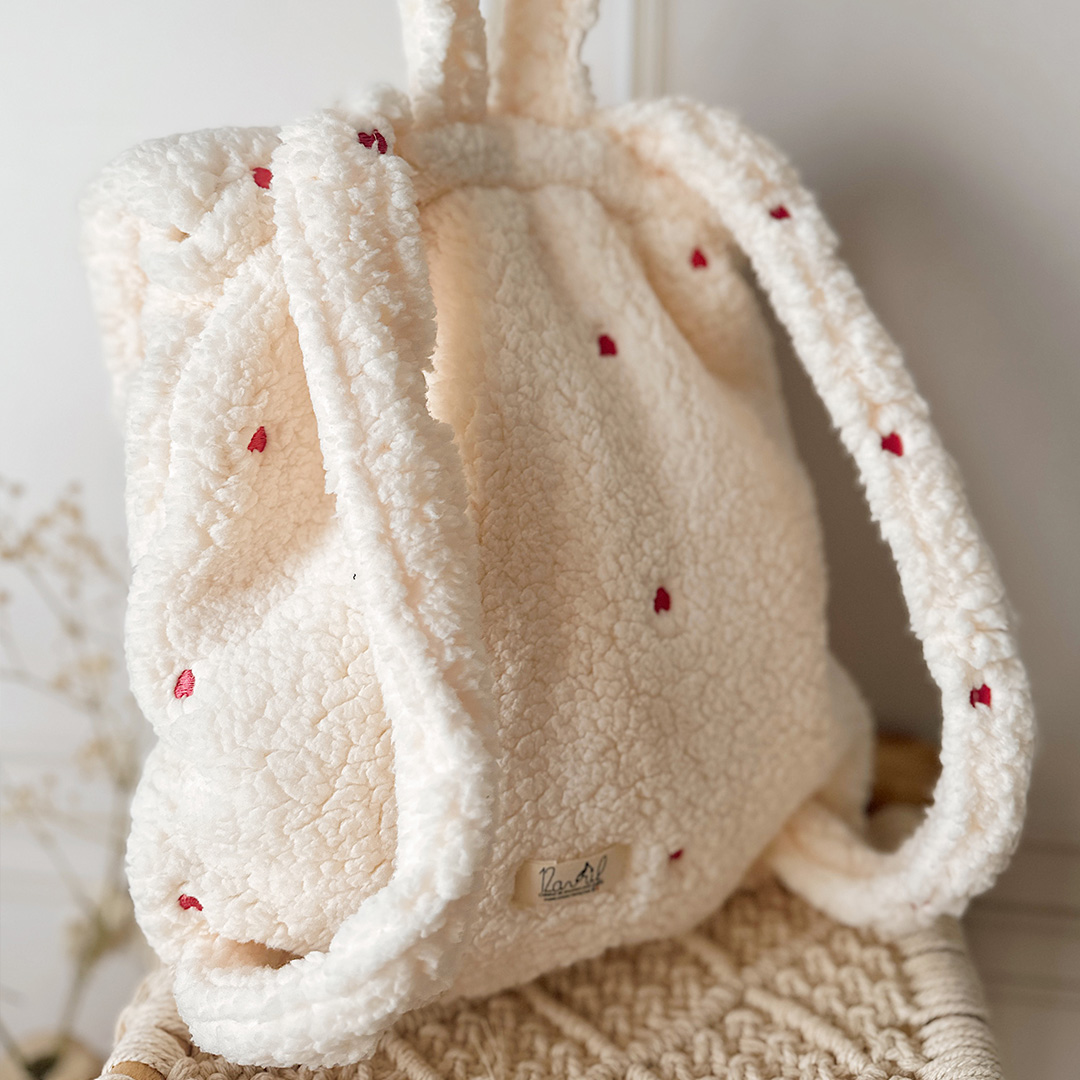 Adoptez notre tout nouveau sac à dos, il est idéal pour emporter le change, le biberon, la gourde, le départ pour la crèche, la nounou mais aussi les premiers pas pour l’école ! Il est tout doux, tout mou et tout léger pour prendre soin du dos de votre enfant. Il est réalisé en fausse fourrure sherpa écrue , ouatiné , dans nos ateliers français. Notre emblématique pompon vient habillé le petit rabat qui est lui même muni d’une pression. Les anses sont ajustables en réglant les petits nœuds.
