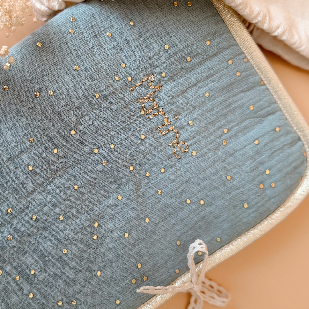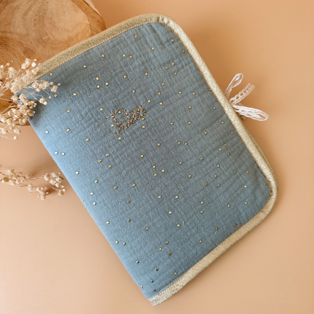 Pour protéger le carnet de santé tout en douceur et lui offrir une jolie enveloppe, voici l’accessoire qui rend les visites chez le médecin un peu plus gaies ! Fermeture au côté avec un joli lien en dentelle de coton. Il est réalisé notre joli motif unisexe pois dorés et fond vert amande, légèrement rembourré et biaisé par un ruban beige doré.