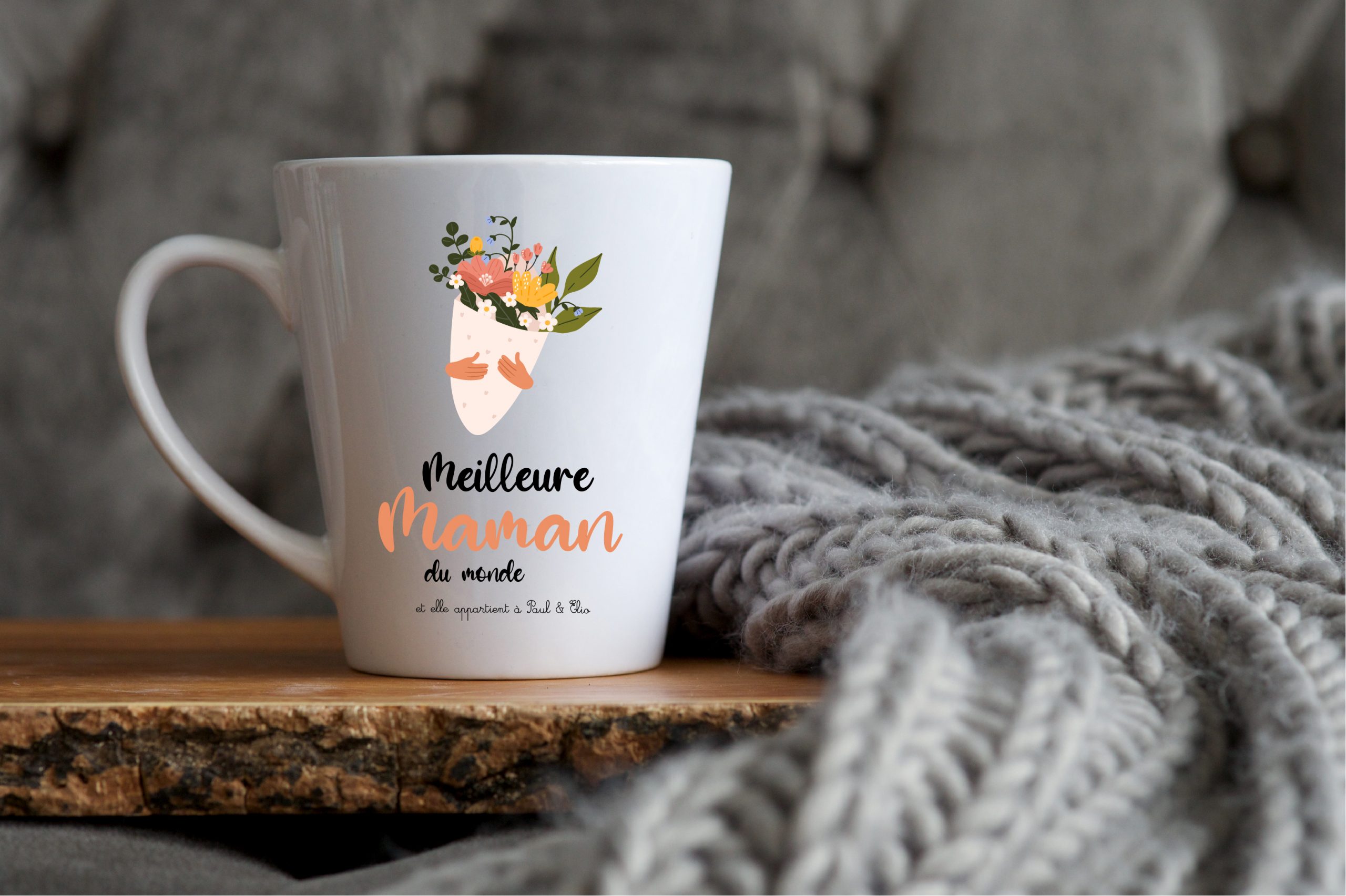 Ce mug conique en céramique est décoré avec l’inscription « Meilleure maman du monde » et un joli dessin de fleur. Sous cette inscription, vous pouvez ajouter « et elle appartient à [prénom des enfants] » pour personnaliser davantage ce cadeau. Un geste spécial pour une maman exceptionnelle !