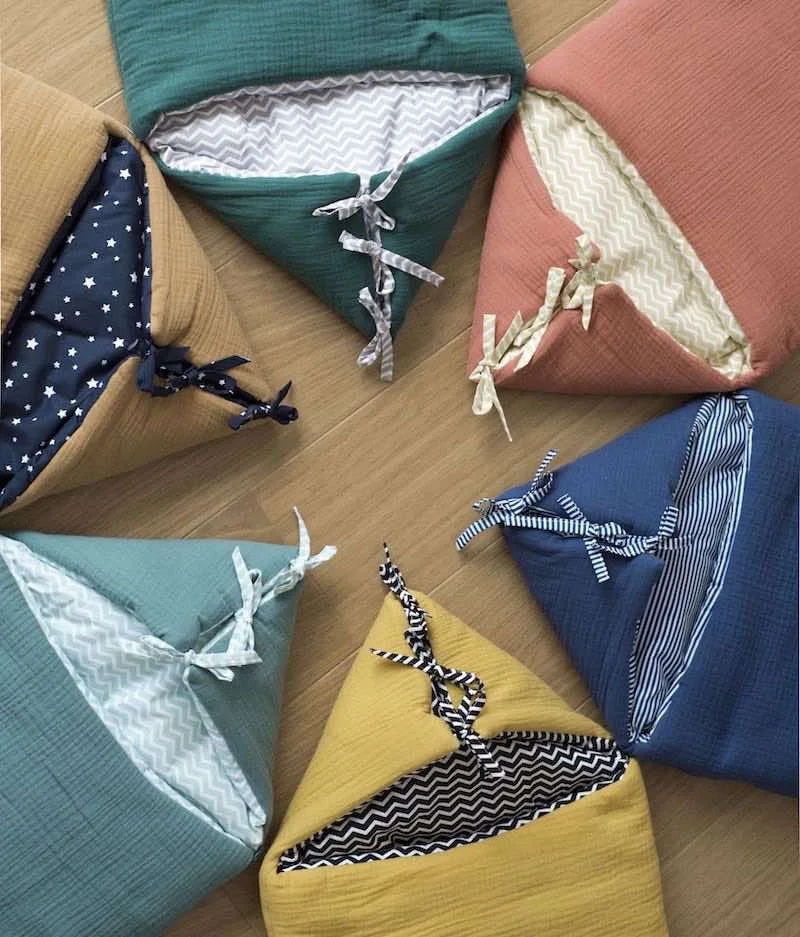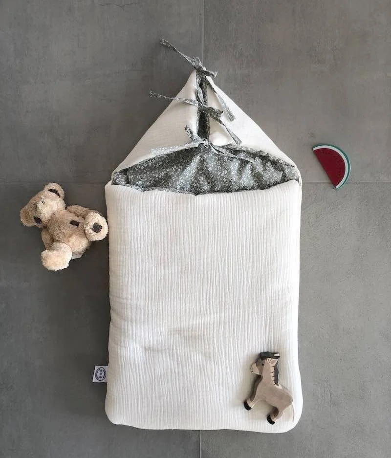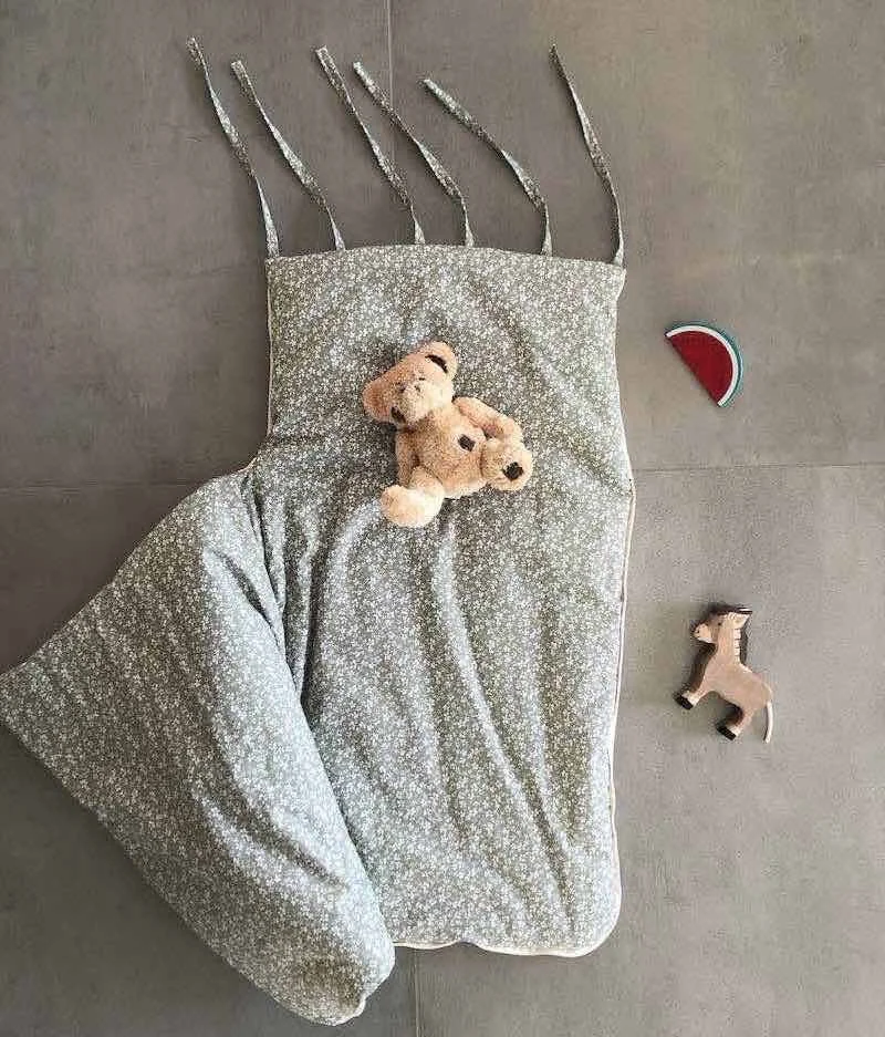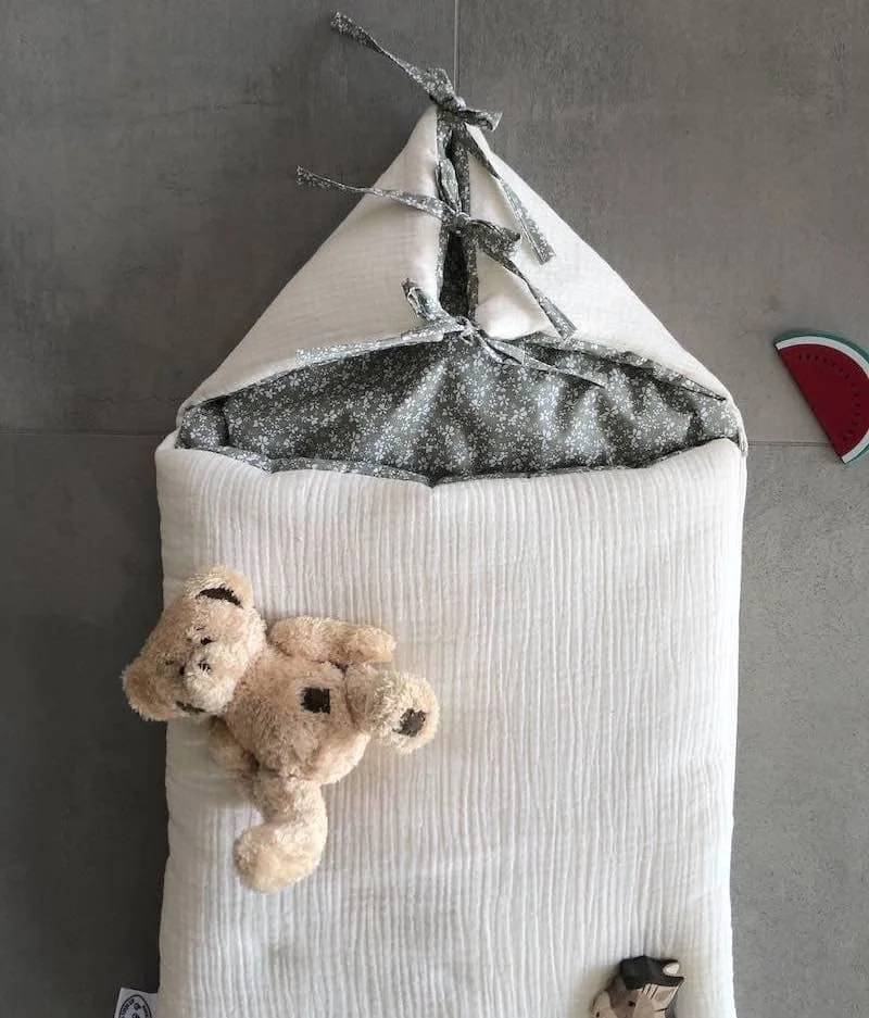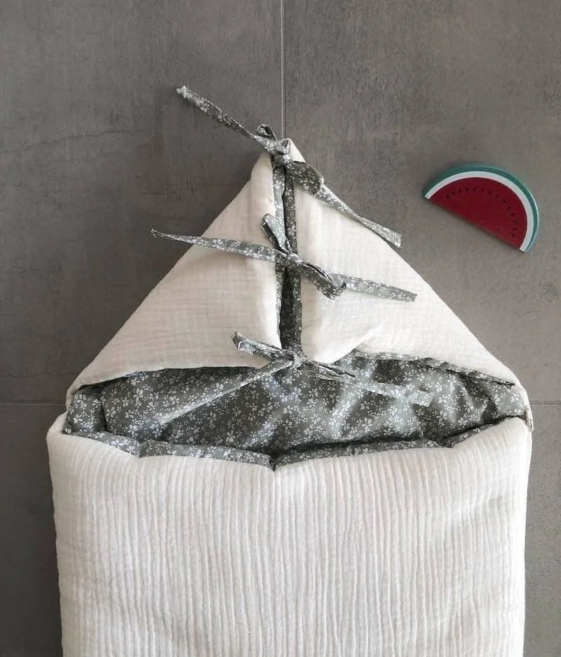 - Extérieur en double gaze écru et intérieur en coton vert à motifs fleuris certifiés sans substance nocive & garni de ouate hypoallergénique.