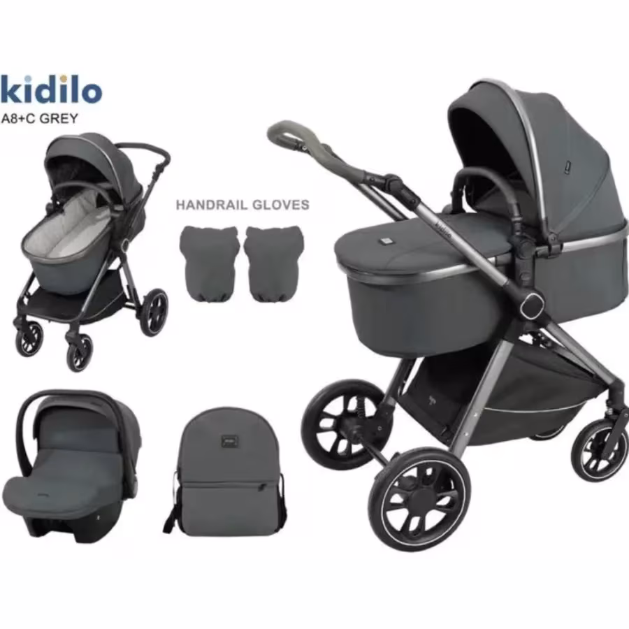 Pack Poussette A8+C Pour Bebe – Kidilo comprend tous les éléments nécessaires pour prendre soin de votre enfant dès la naissance. Il comprend une poussette, siège auto, couvre-pieds, habillage pluie, moustiquaire, sac à dos pour maman, gants de main courante et matelas.