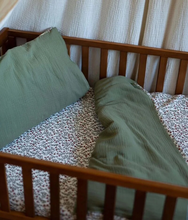 - Réversible : un côté en double gaze de coton écru à motifs fleuris vert, l’autre face en double gaze de coton uni vert sauge certifiées sans substance nocive
