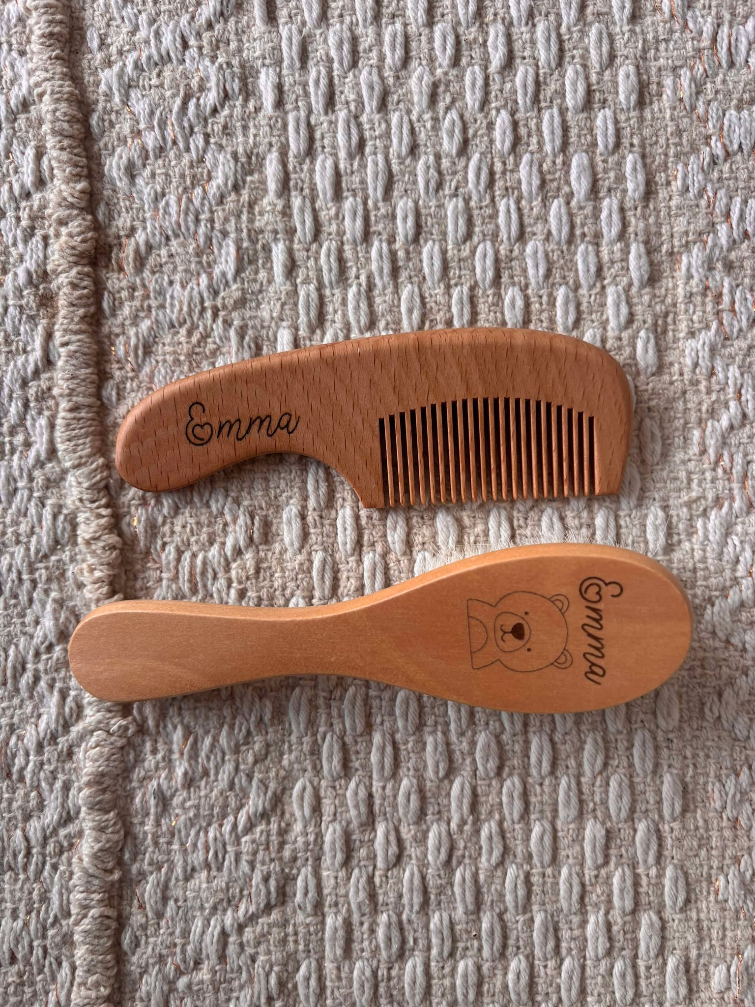 ✔ Peigne et brosse en bois personnalisés : Ce set adorable pour bébé est gravé avec son prénom et un animal au choix (voir photo 4).