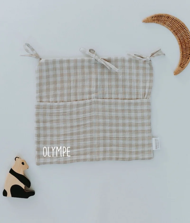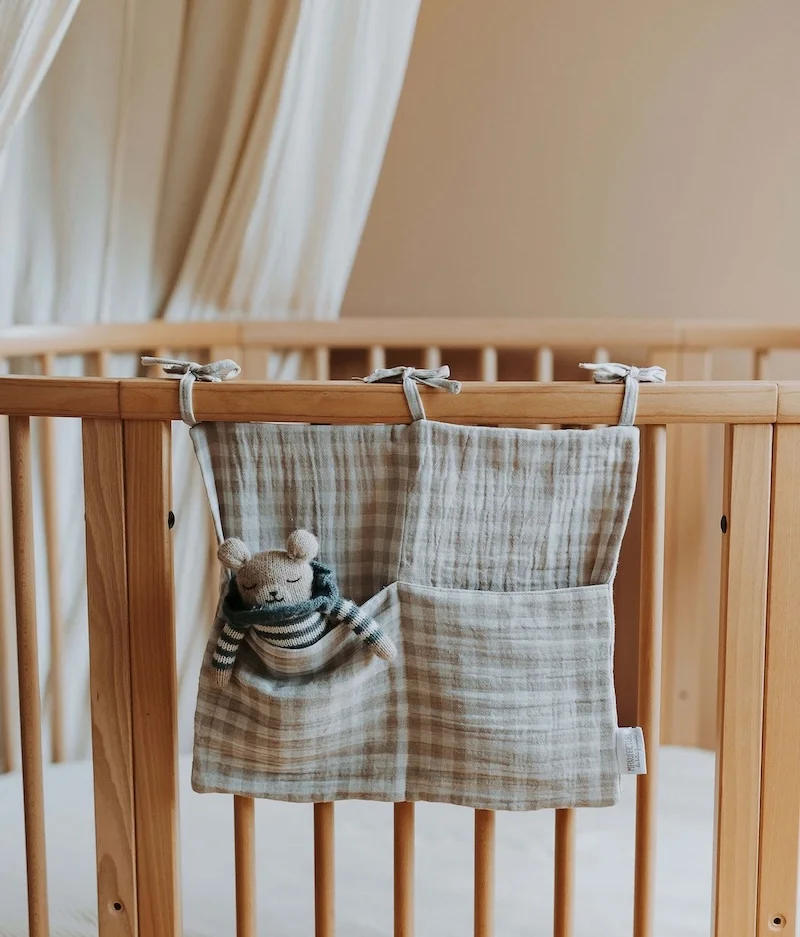 Craquez pour notre range doudou, cet accessoire déco s’attache au lit de votre bébé ou se suspend à une jolie patère pour y déposer toutes ses petites affaires à avoir sous la main : livres, tétines, pyjama ou encore son doudou.
