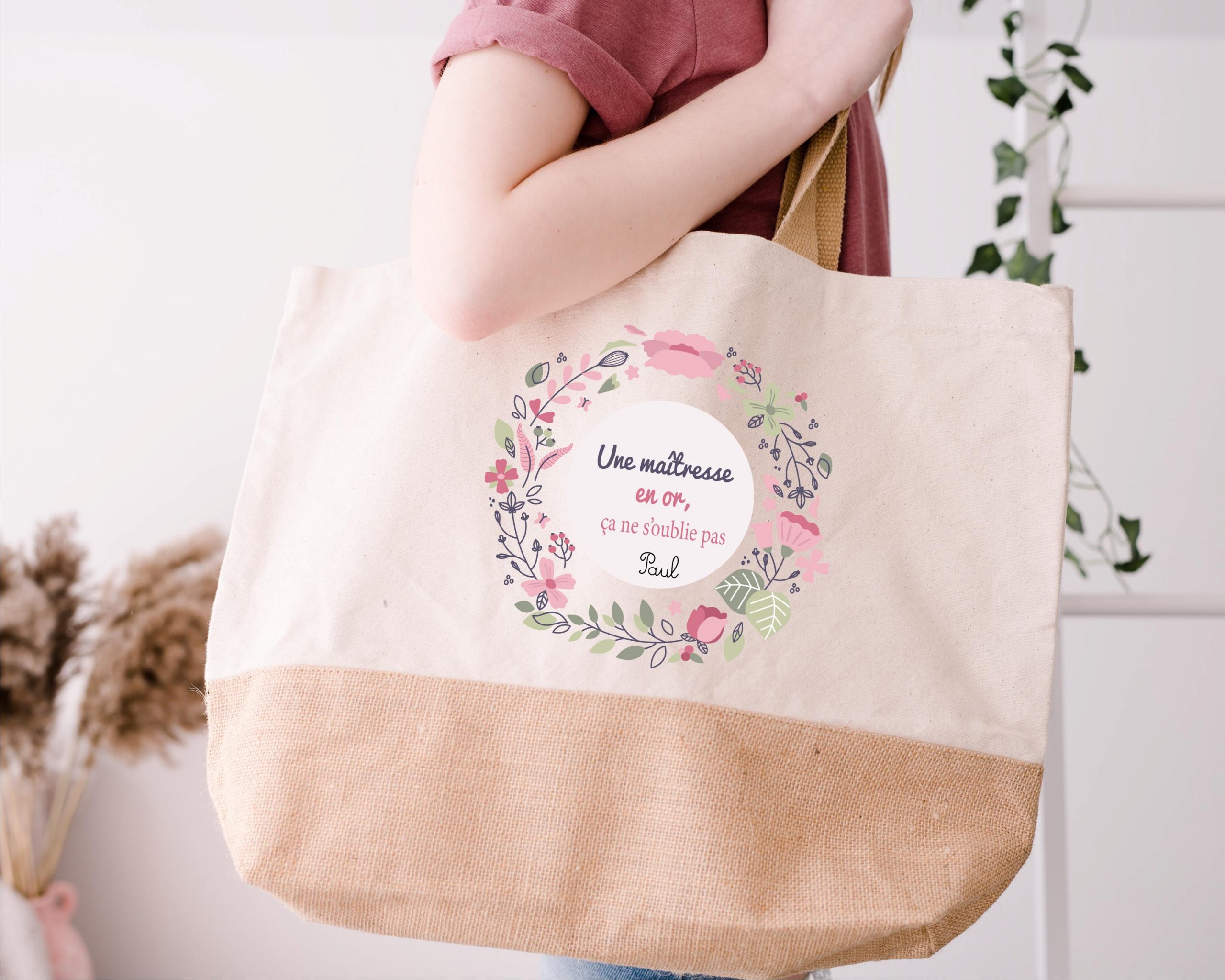 Ce sac en toile écrue et base en jute naturelle est orné d’un motif floral rose et du message “Une maîtresse en or, ça ne s’oublie pas”, personnalisable avec le prénom de l’enfant.