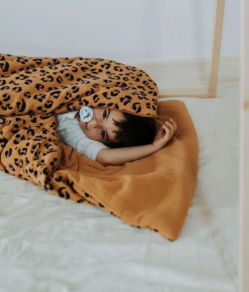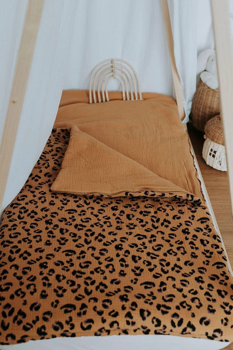 - Extérieur en double gaze de coton camel à motifs léopard noir et violet et intérieur en double gaze de coton uni camel certifiés sans substance nocive.