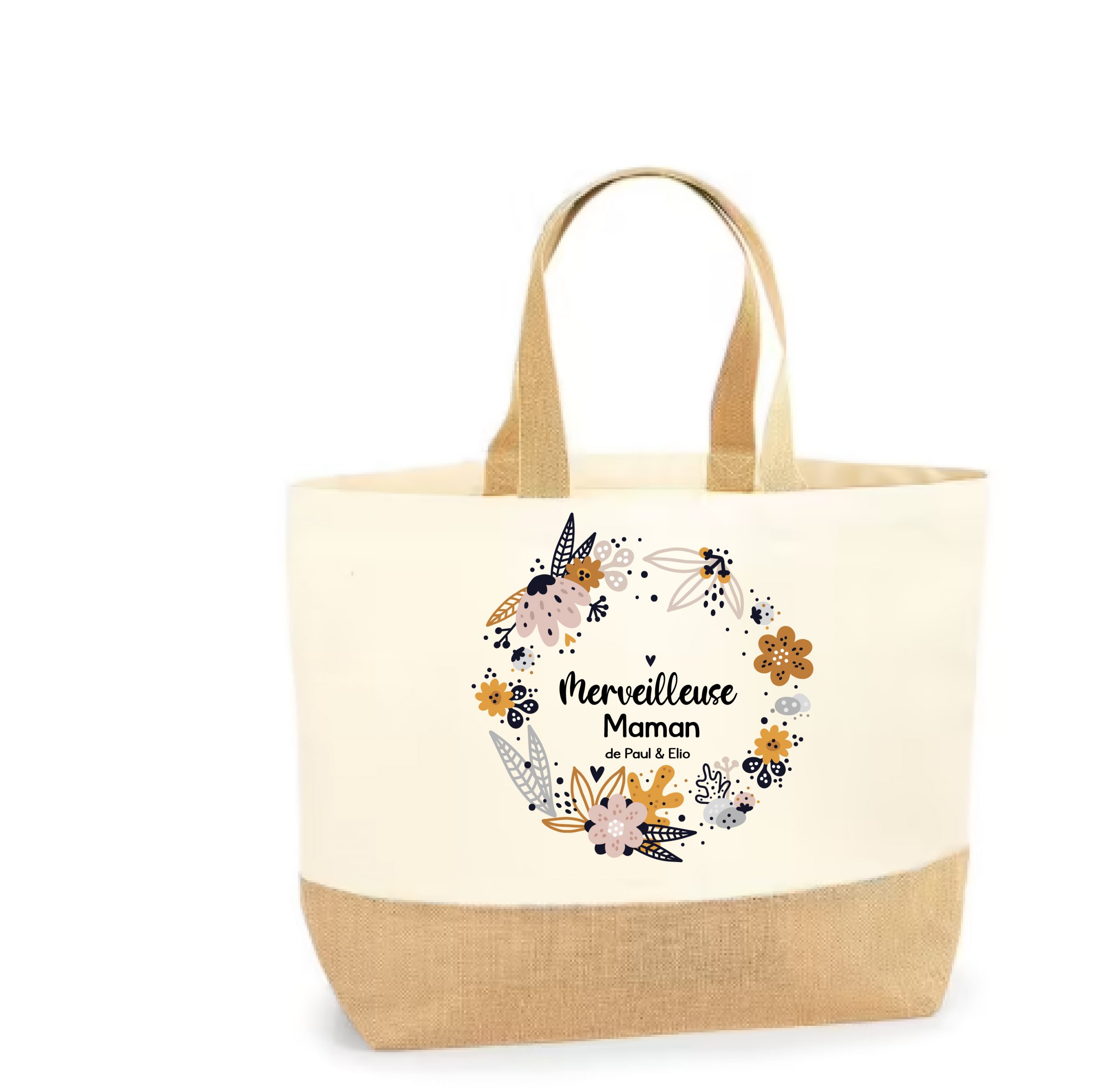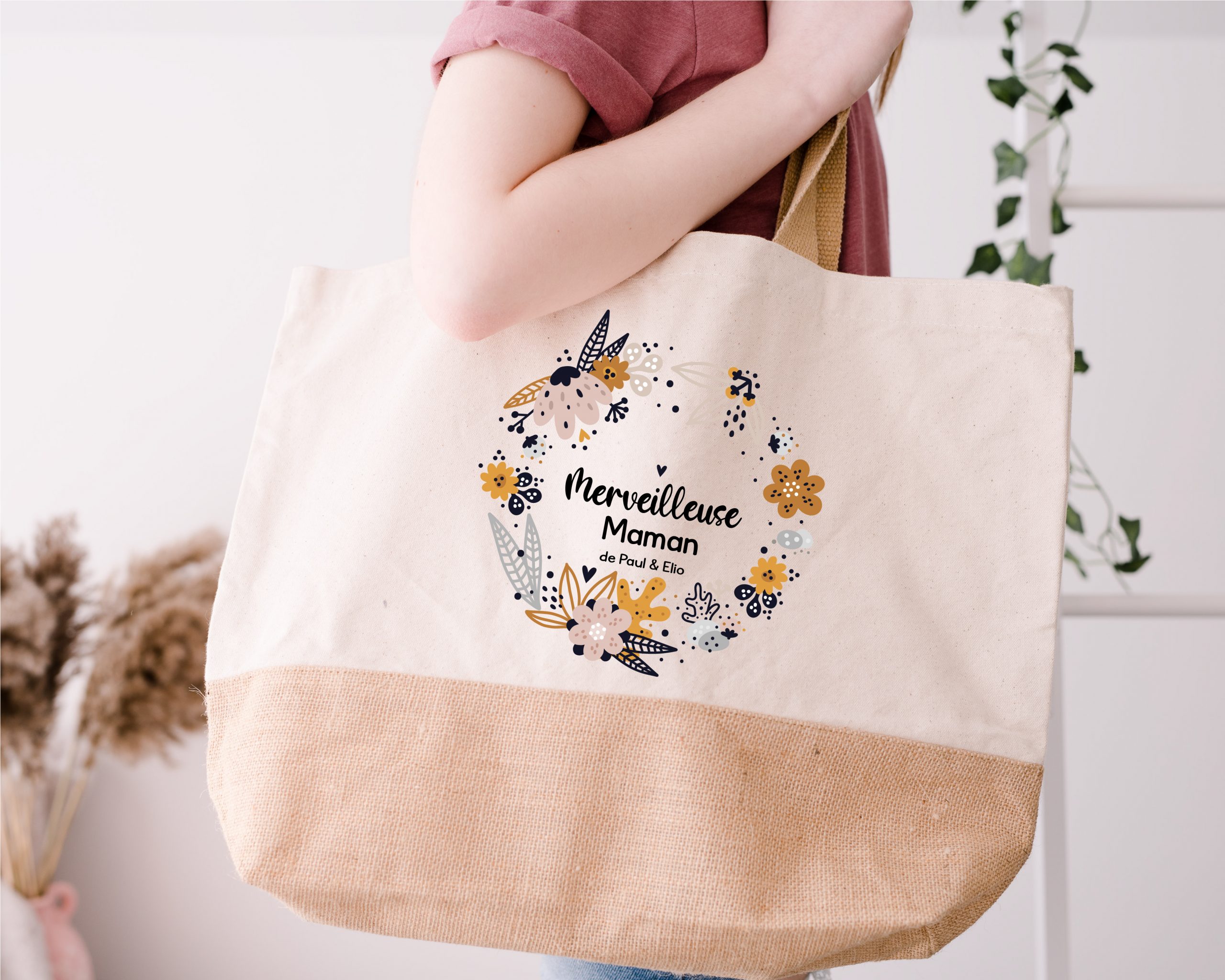 🎁 Offrez à une maman exceptionnelle ce magnifique sac shopping personnalisé en toile de coton avec base en jute laminé. Ce sac est orné d’un beau bouquet de fleurs et porte l’inscription personnalisée « Meilleure Maman du Monde » suivie des prénoms des enfants, un cadeau élégant et personnel qu’elle adorera.
