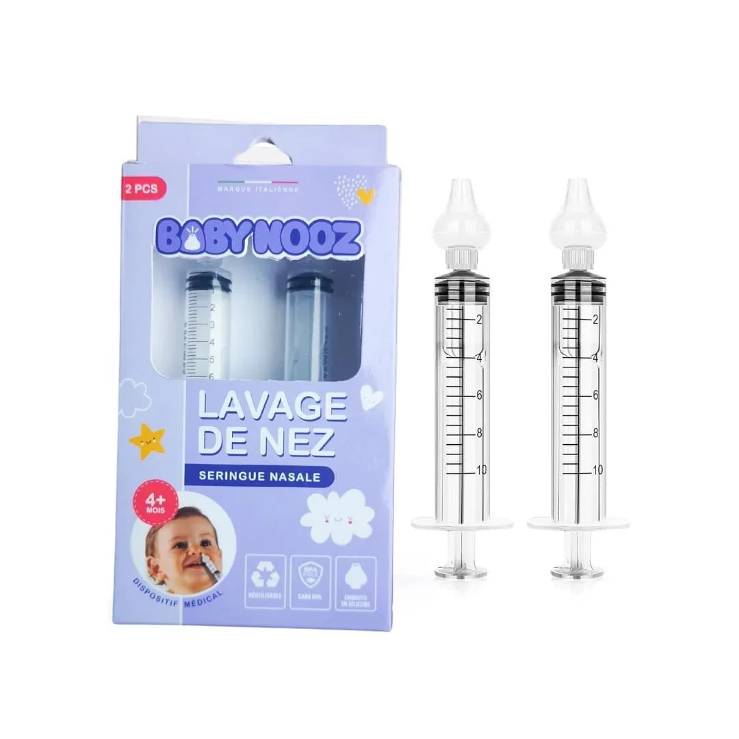 Ce pack contient 2 seringues nasales de 10 ml chacune, réutilisables après nettoyage,