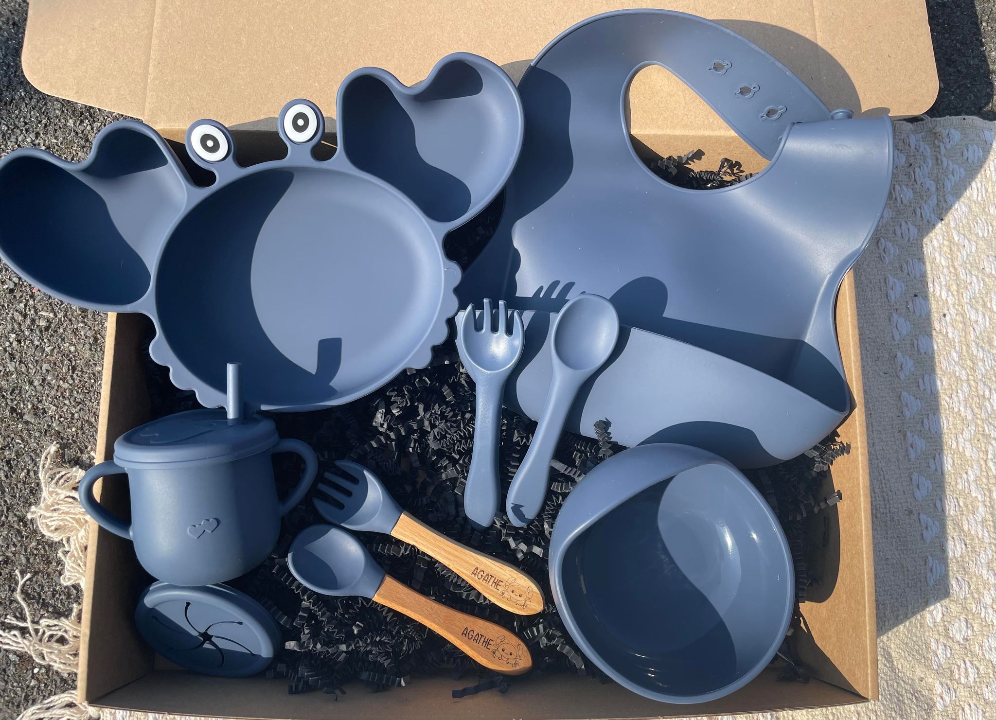 Offrez à votre enfant un set repas ludique et pratique avec notre box « Thème Crabes » ! Parfait pour rendre chaque repas encore plus fun, ce set est personnalisé avec le prénom de votre enfant ✨. Composé de 5 pièces, chaque élément est conçu en silicone de haute qualité, sans BPA, et passe au micro-ondes et au lave-vaisselle pour un maximum de praticité et de sécurité.