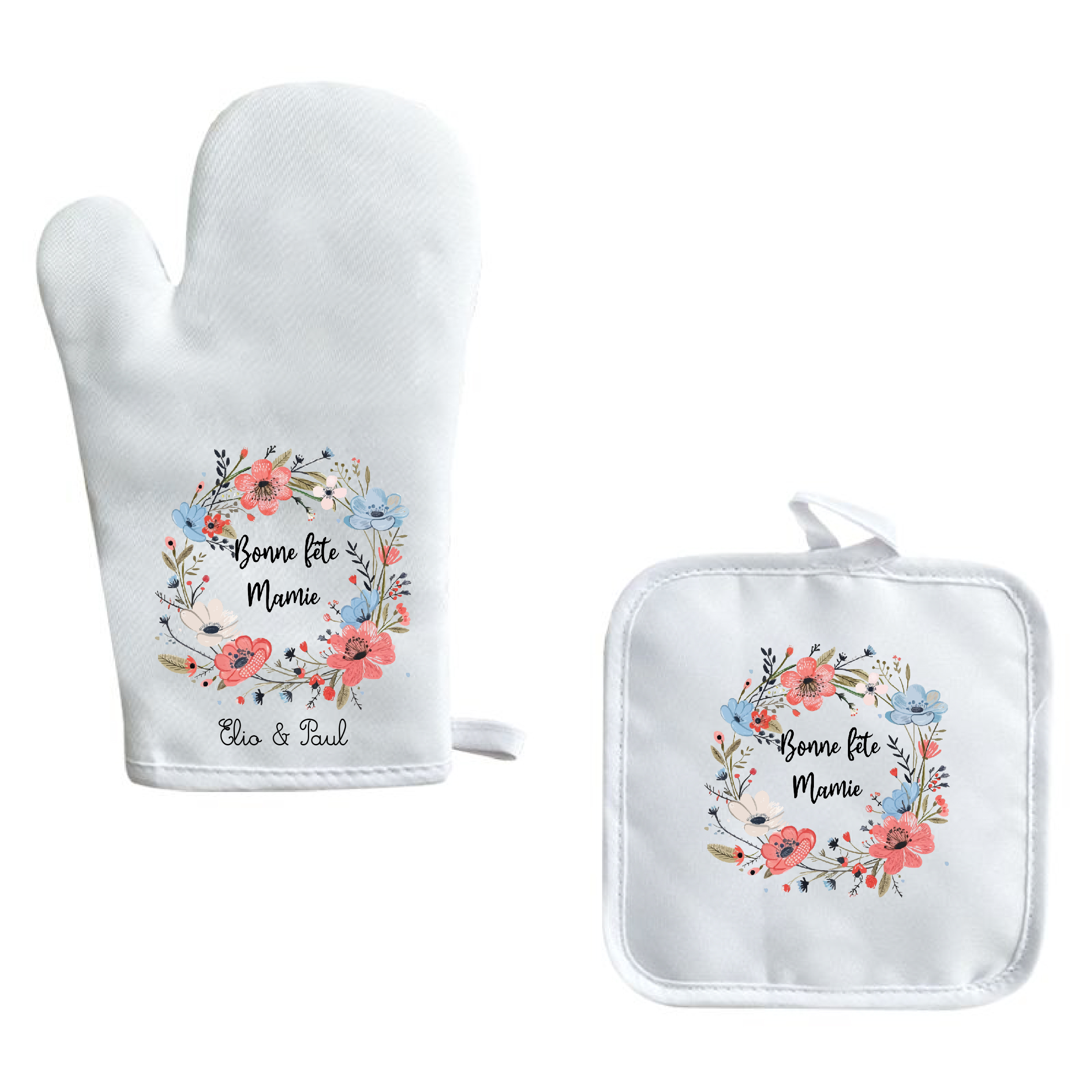 Offrez à votre mamie un cadeau unique et fonctionnel avec ce set de gant et manique de cuisine personnalisés. Décoré d’une délicate couronne de fleurs et du message « Bonne Fête Mamie », ce set peut être personnalisé avec les prénoms des petits-enfants pour rendre ce cadeau encore plus spécial. Parfait pour la fête des grands-mères, un anniversaire, ou toute occasion où vous voulez faire plaisir à mamie !