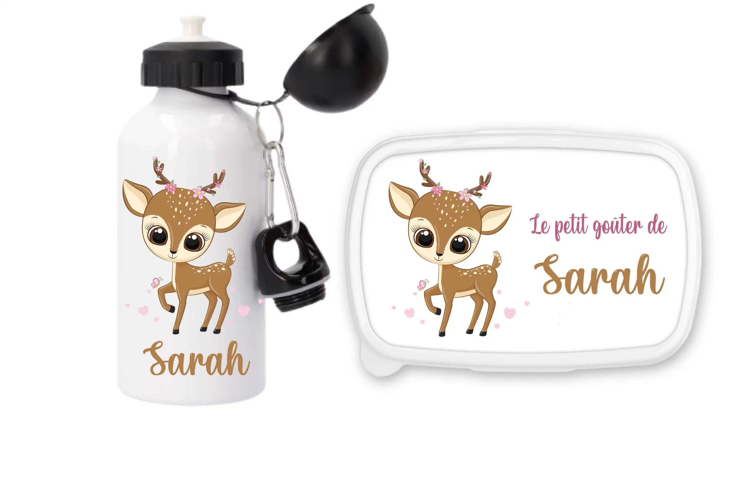 Ce set complet accompagne votre enfant dès la rentrée scolaire : gourde sport 500 ml personnalisée et boîte à goûter assortie au fond rose, décorés du motif faon. Personnalisez-le avec le prénom de votre enfant pour une rentrée colorée et pratique.