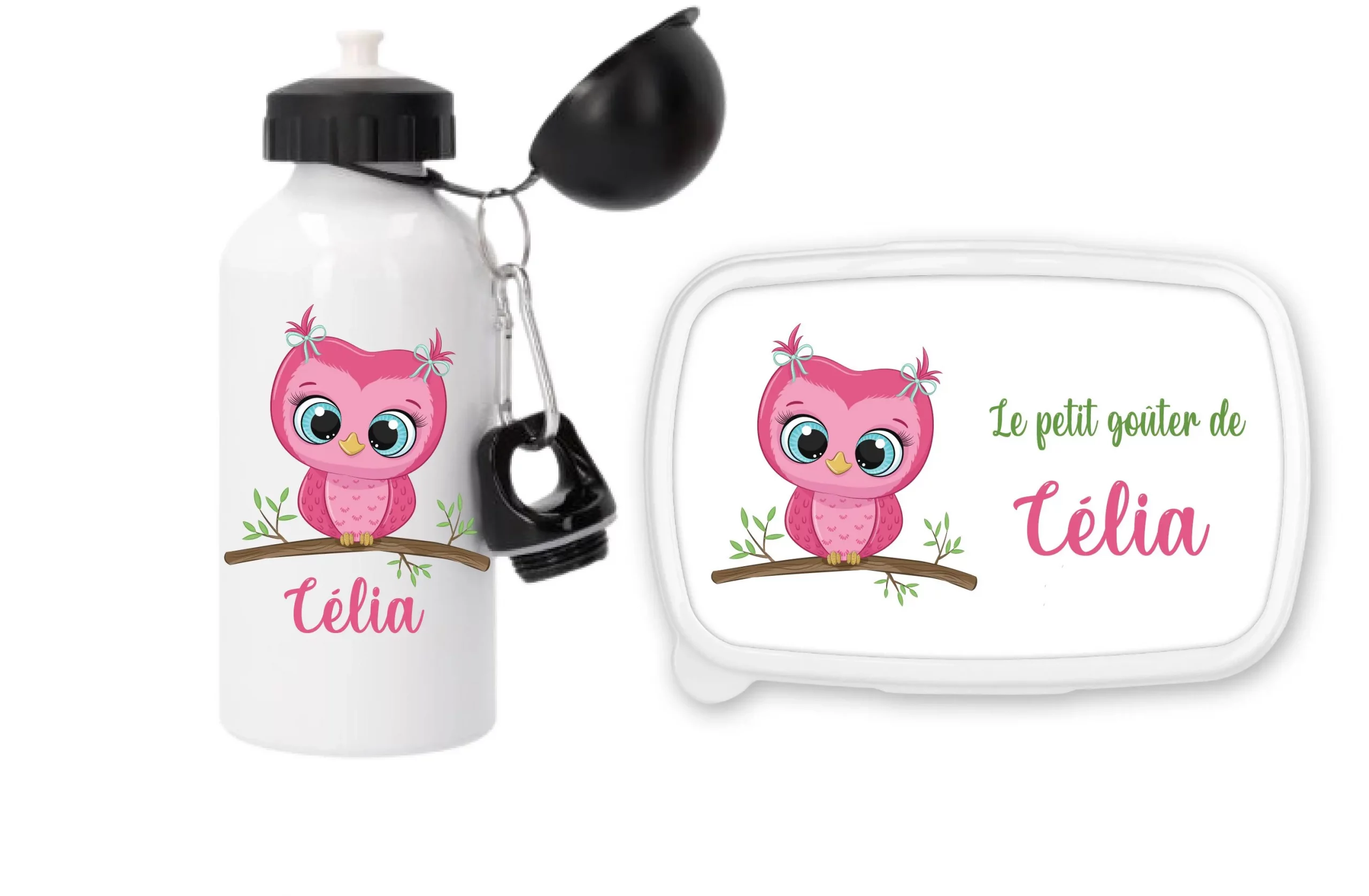 Ce set complet accompagne votre enfant dès la rentrée scolaire : gourde sport personnalisée et boîte à goûter assortie au fond rose, décorés du motif hiboux rose. Personnalisez-le avec le prénom de votre enfant pour une rentrée colorée et pratique.