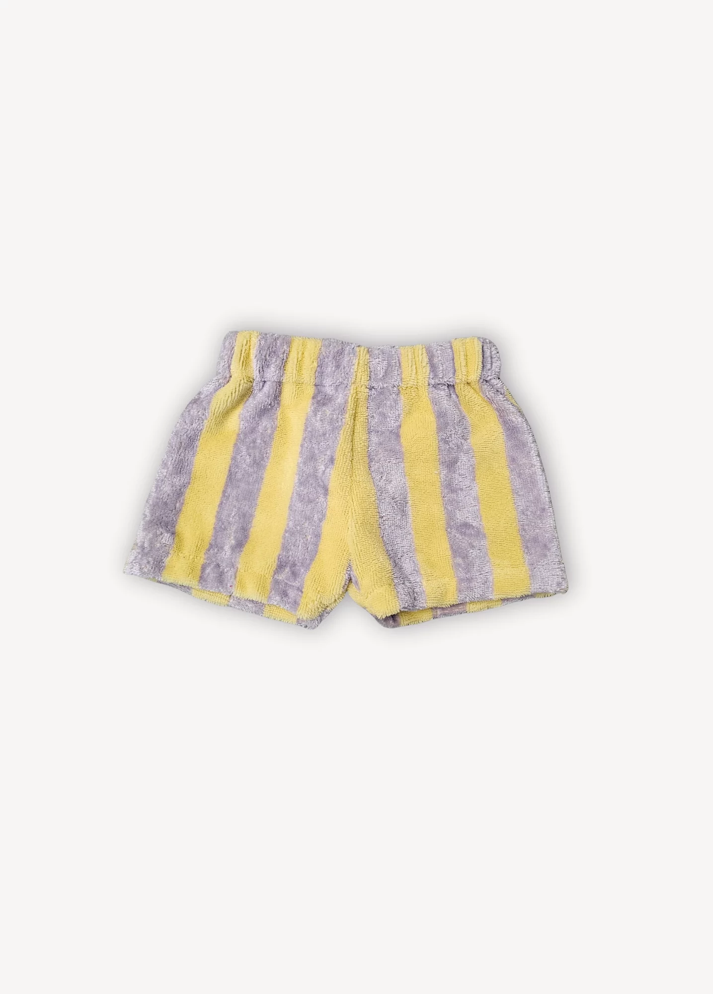 Craquez pour notre nouveau short en éponge de bambou rayé lilas et jaune, une pièce estivale aussi confortable que stylée, pensée pour les tout-petits de 3 mois à 6 ans. Avec sa matière ultra douce et moelleuse, ce short rappelle l’esprit de notre poncho iconique, en version courte et légère, parfaite pour les journées ensoleillées.