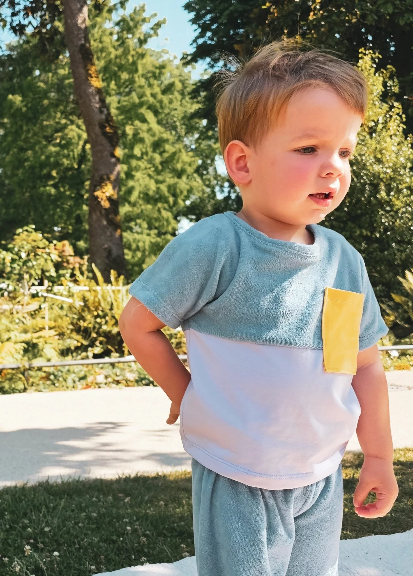 Ce t-shirt trois matières associe une éponge de coton bleu polaire ultra-douce, un jersey lilas léger et respirant, et une poche contrastante jaune soleil pour une touche de peps. Sa découpe horizontale au milieu du devant et du dos lui donne un look structuré et moderne, tout en assurant un tombé impeccable.