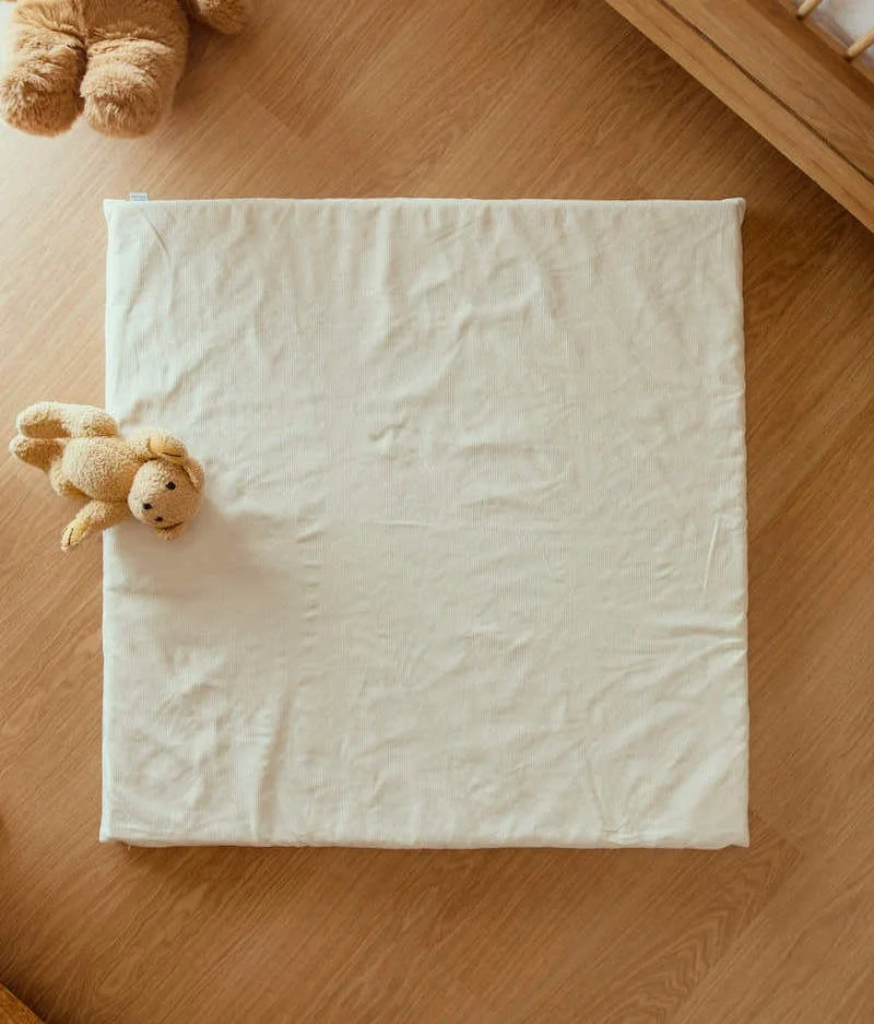 - Réversible : une face en velours de coton écru et l’autre face en coton vert à motifs fleuris certifiés sans substance nocive.