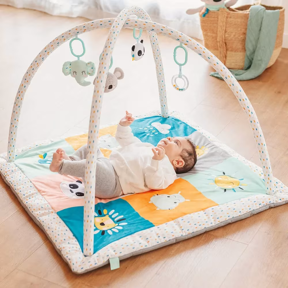 - Éléments Accrocheurs : Doté de jouets suspendus, ce tapis encourage la prise en main et le développement de la coordination.