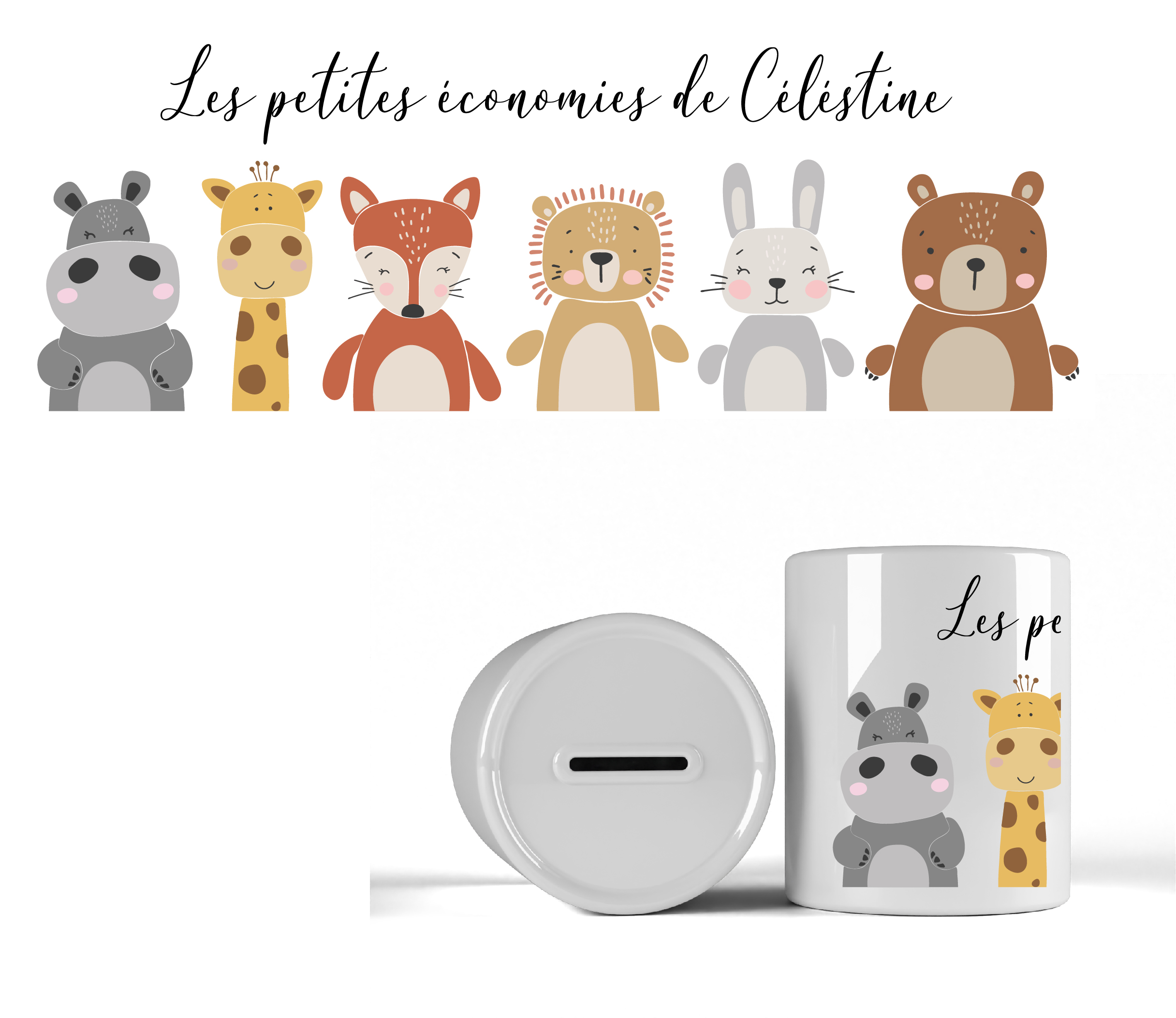 Offrez un cadeau unique et ludique avec cette charmante tirelire personnalisée en céramique. Décorée de petits animaux mignons et de l’inscription « Les Petites Économies de (Prénom) », cette tirelire est parfaite pour encourager les enfants à épargner dès leur plus jeune âge. Que ce soit pour un cadeau de naissance, un anniversaire ou juste pour faire plaisir, cette tirelire deviendra rapidement un objet précieux et pratique dans leur chambre.