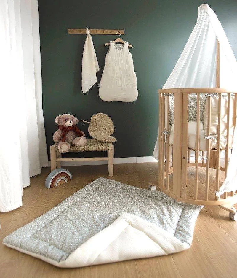 - Réversible : un côté double gaze écru et un autre côté en coton vert à motifs fleuris certifiés sans substance nocive