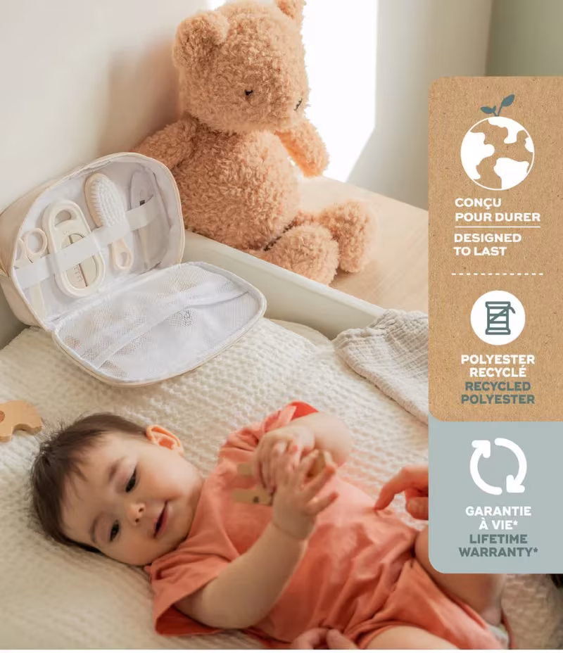 Conçue pour être pratique et durable, elle comprend une sélection d’accessoires indispensables : thermomètre digital, brosse douce, mouche-bébé, ciseaux à bouts ronds, lime, anneau de dentition, masseur gingival. Et d’autres indispensables du quotidien.