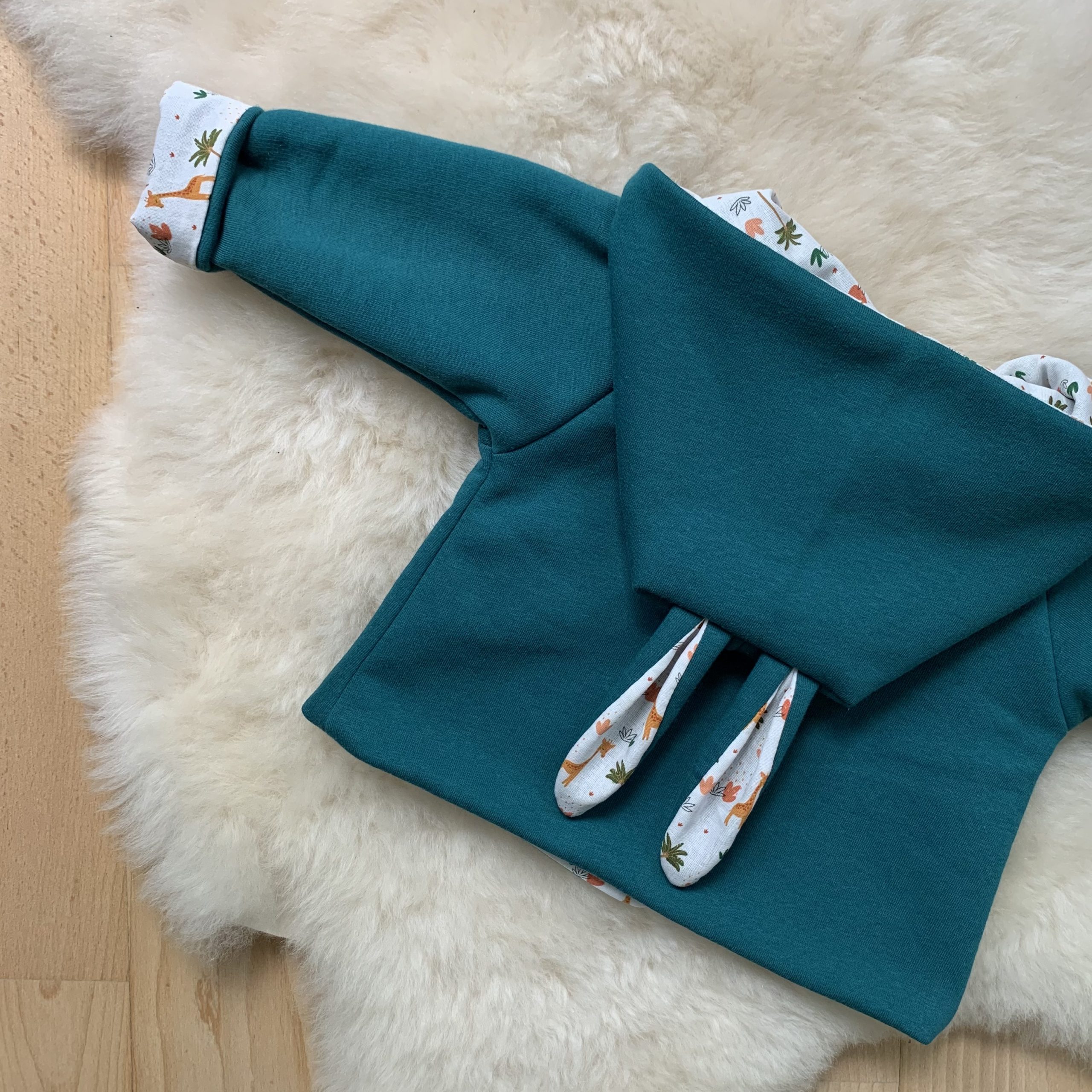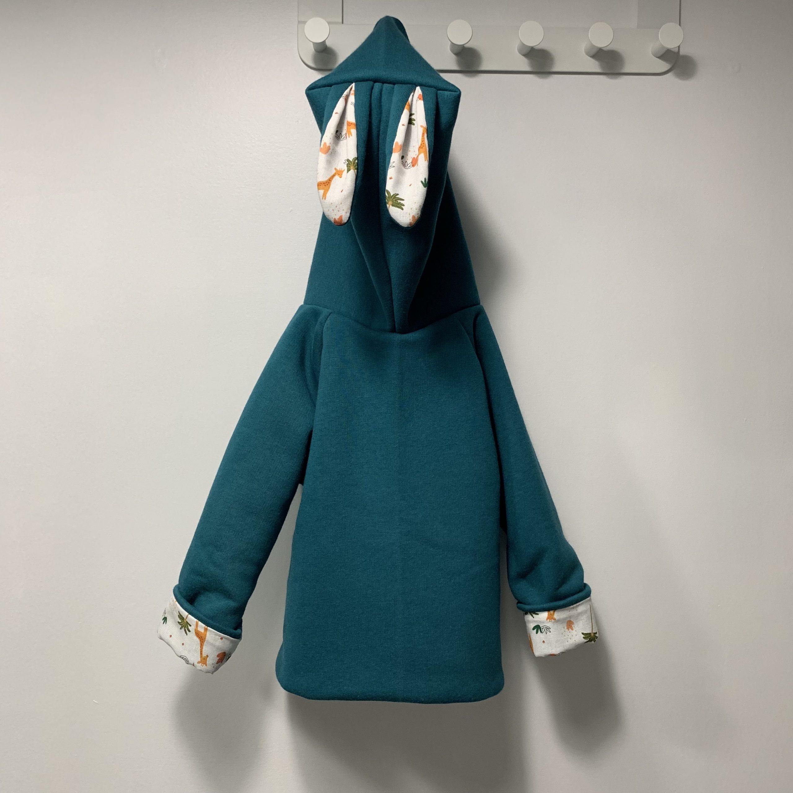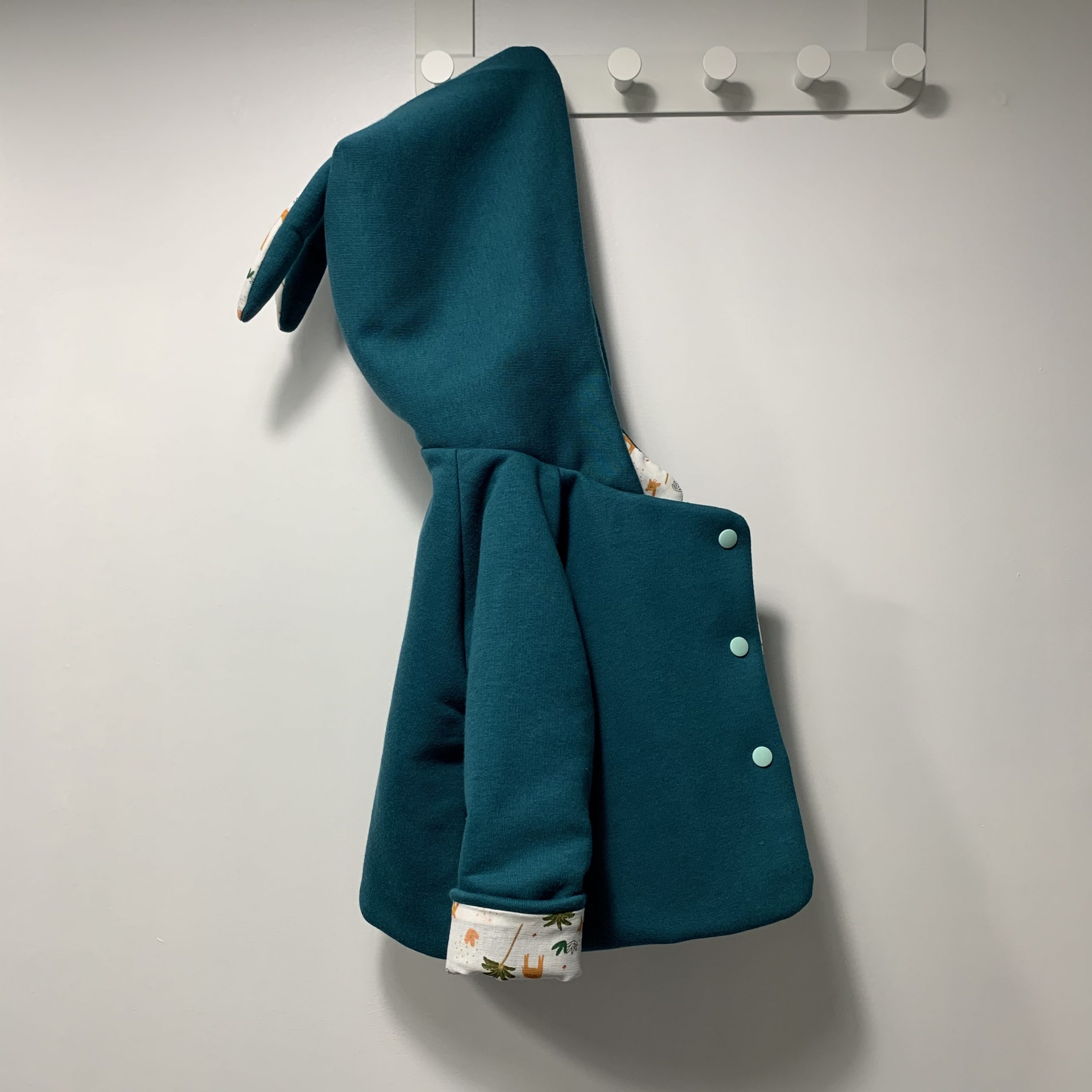 Détails : les oreilles de lapin sur la capuche et fermeture par des pressions KAM Oekotex